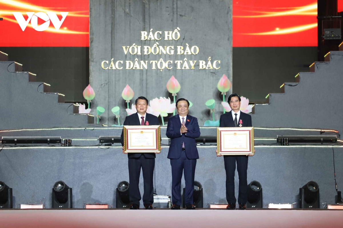Ông Hoàng Quốc Khánh, Bí thư Tỉnh ủy và ông Lò Minh Hùng, Phó Bí thư Thường trực Tỉnh ủy Sơn La đón nhận Huân chương Lao động hạng Ba.