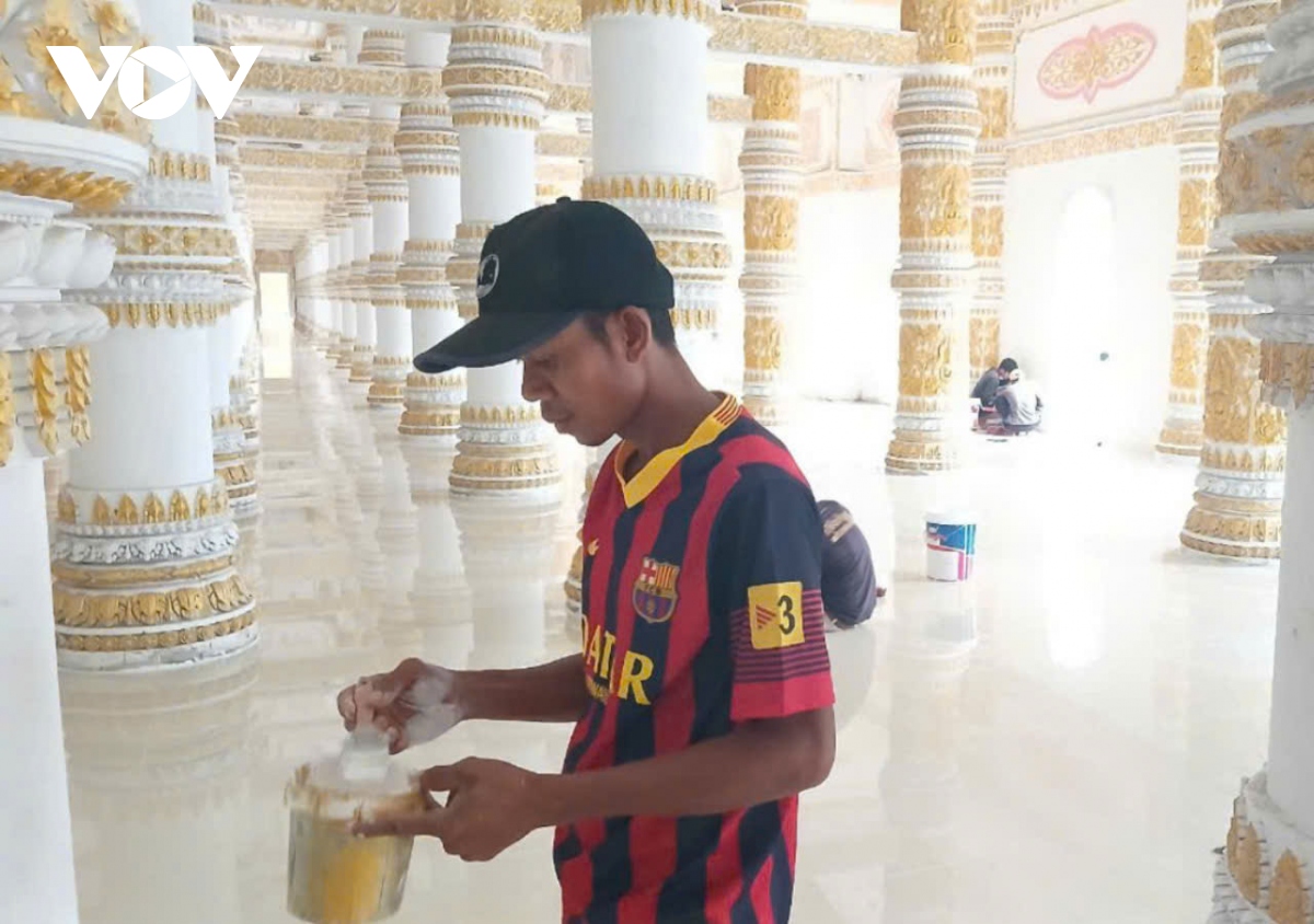 Bà con tu bổ, sơn phết các cột chùa Bôtum Vong Sa Som Rong ở thành phố Sóc Trăng, tỉnh Sóc Trăng