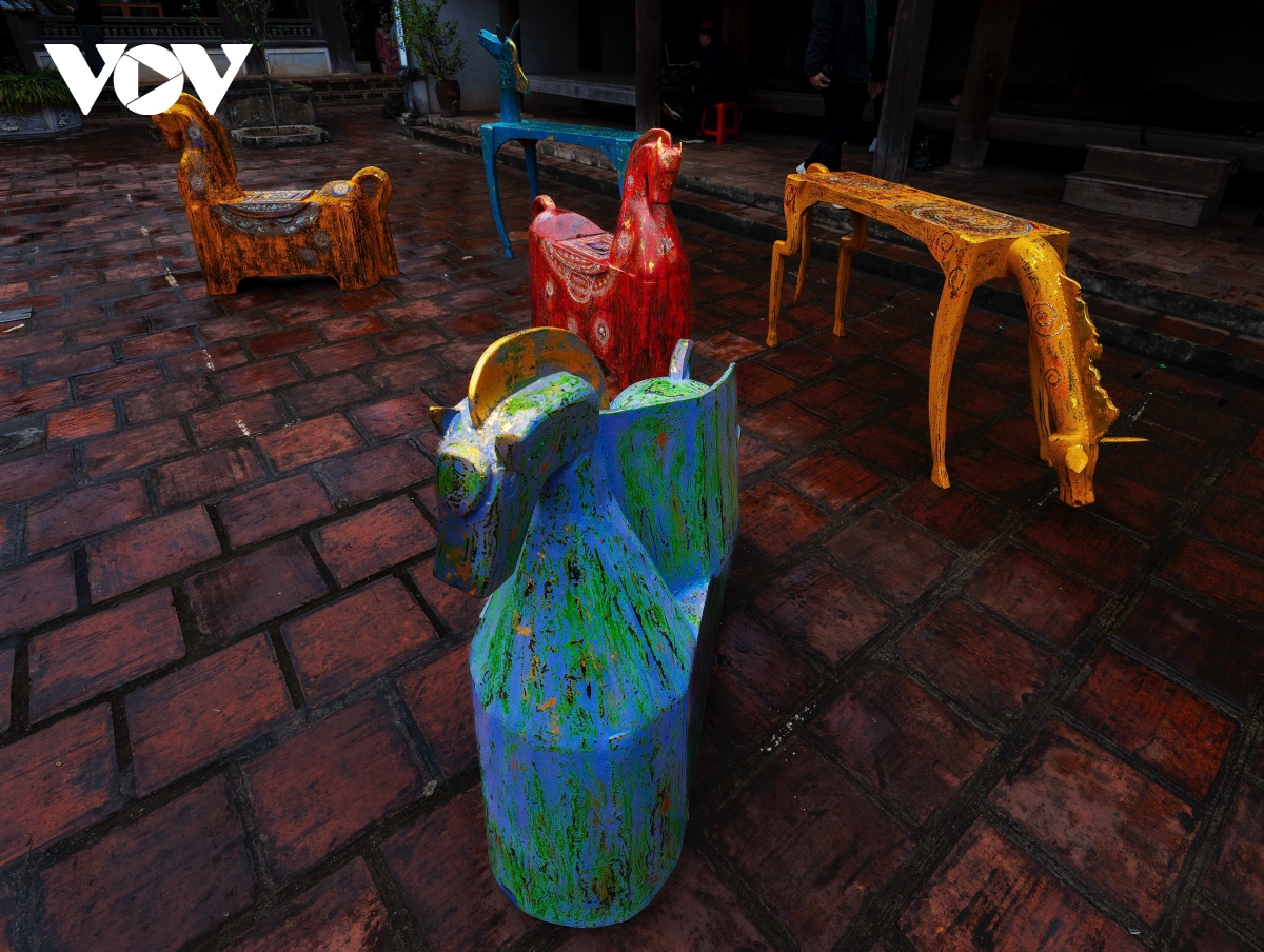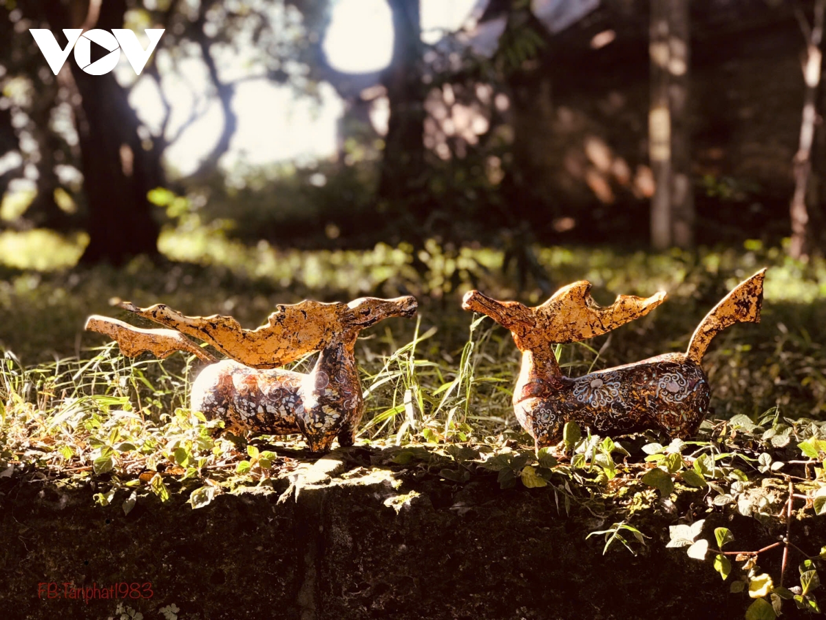 Ngoài đá ong, nghệ nhân còn sử dụng gỗ mít, gỗ nhãn và tre, những vật liệu quen thuộc trong đời sống và tín ngưỡng dân gian Việt Nam. Gỗ được xử lý thủ công trước khi phủ sơn mài nhiều lớp, tạo nên vẻ đẹp ấm áp, gần gũi. Sự kết hợp giữa chất liệu truyền thống và kỹ thuật chế tác tinh xảo giúp các tác phẩm vừa giữ được bản sắc văn hóa vừa mang giá trị thẩm mỹ hiện đại.