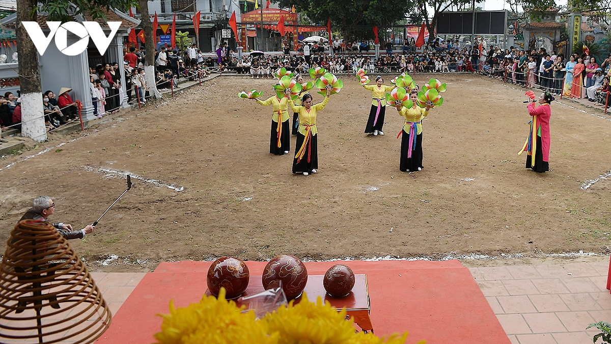 Giữa mối hiệp đấu là những tiết mục văn nghệ vừa đậm chất dân gian, vừa thể hiện không khí sôi động của lễ hội vật cầu truyền thống làng Thúy Lĩnh.