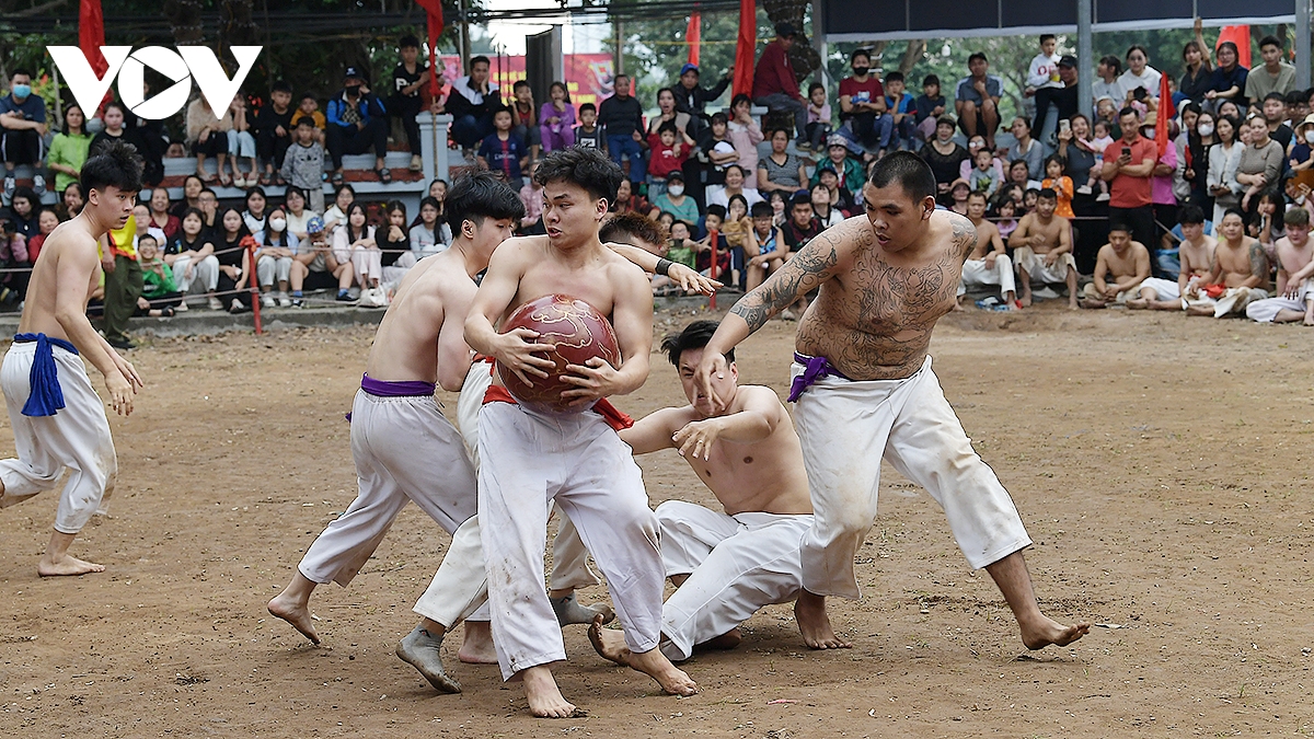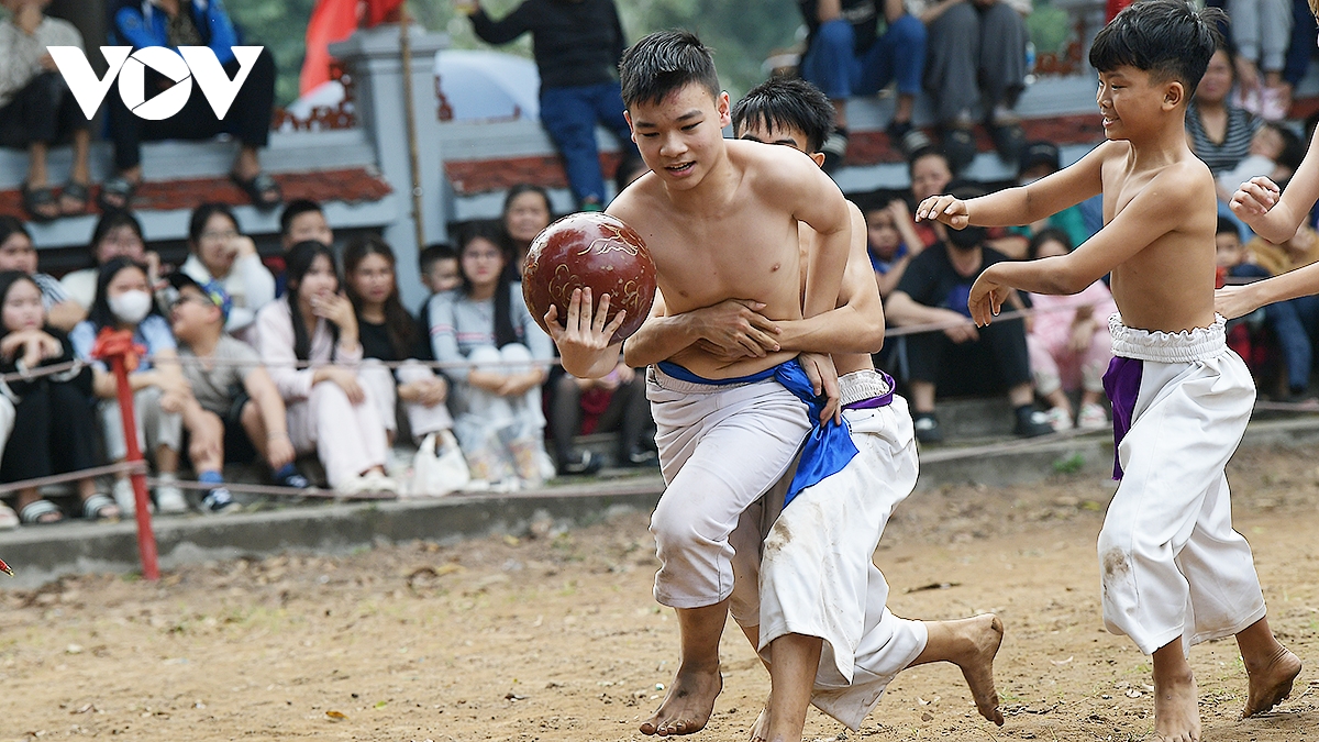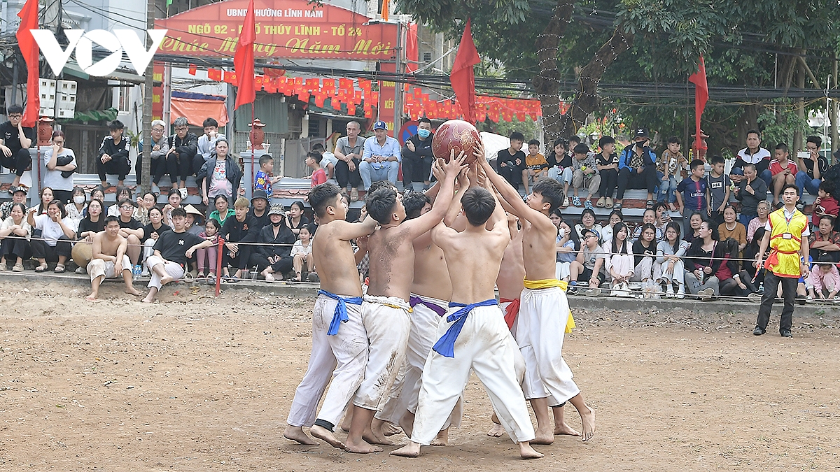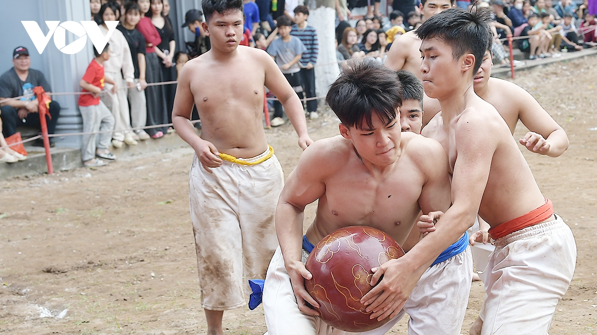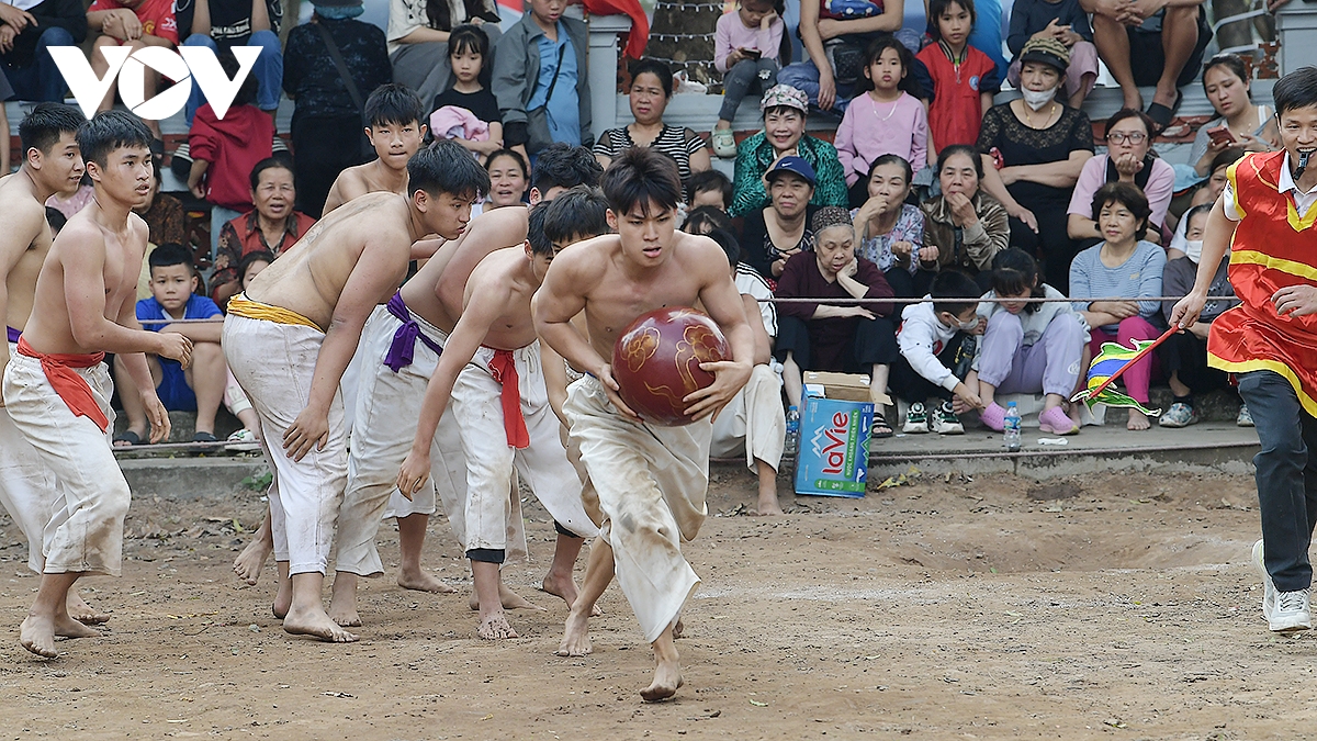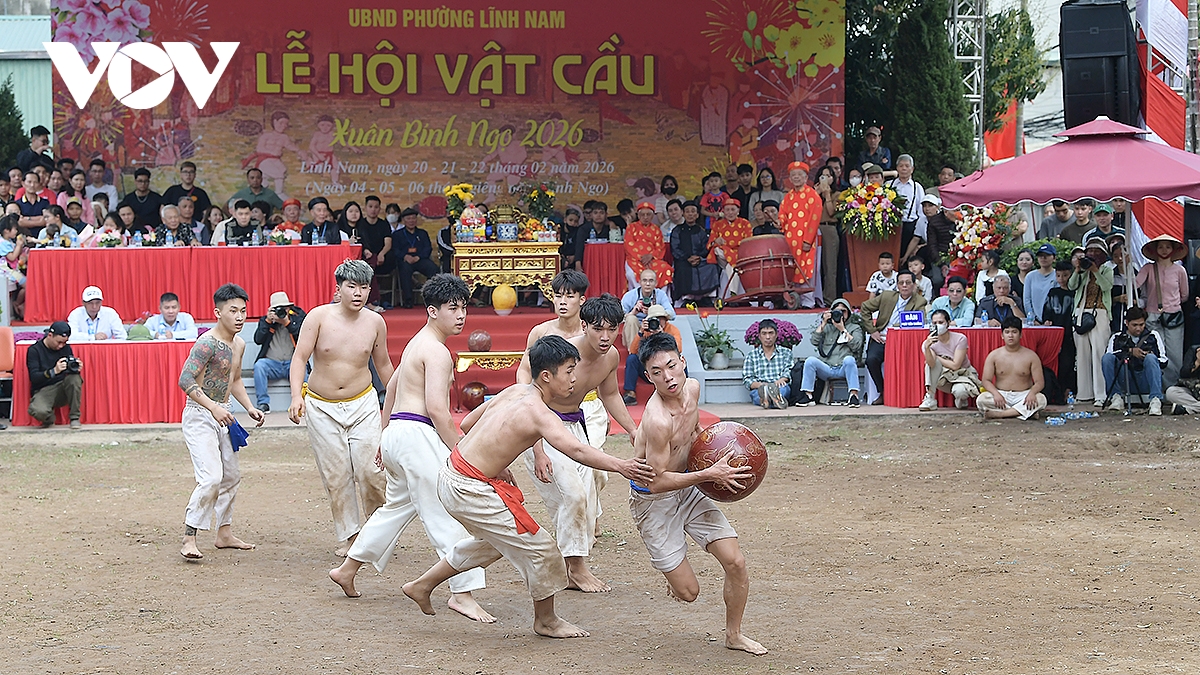 Trong thời tiết ấm áp của những ngày đầu xuân Bính Ngọ 2026, trai tráng Thúy Lĩnh mình trần, mặc quần trắng có thắt đai đỏ, xanh, tím, vàng tương ứng với các đội, đã mang đến những trận đấu kịch tính.