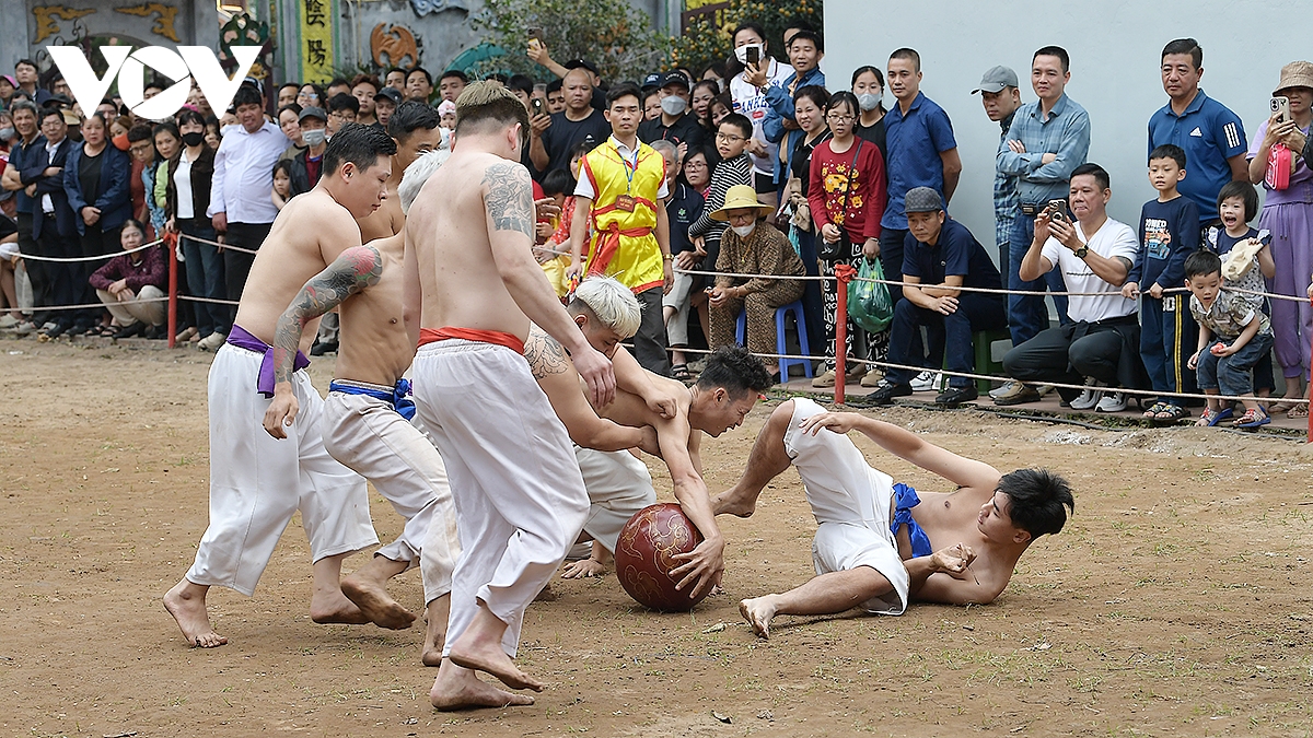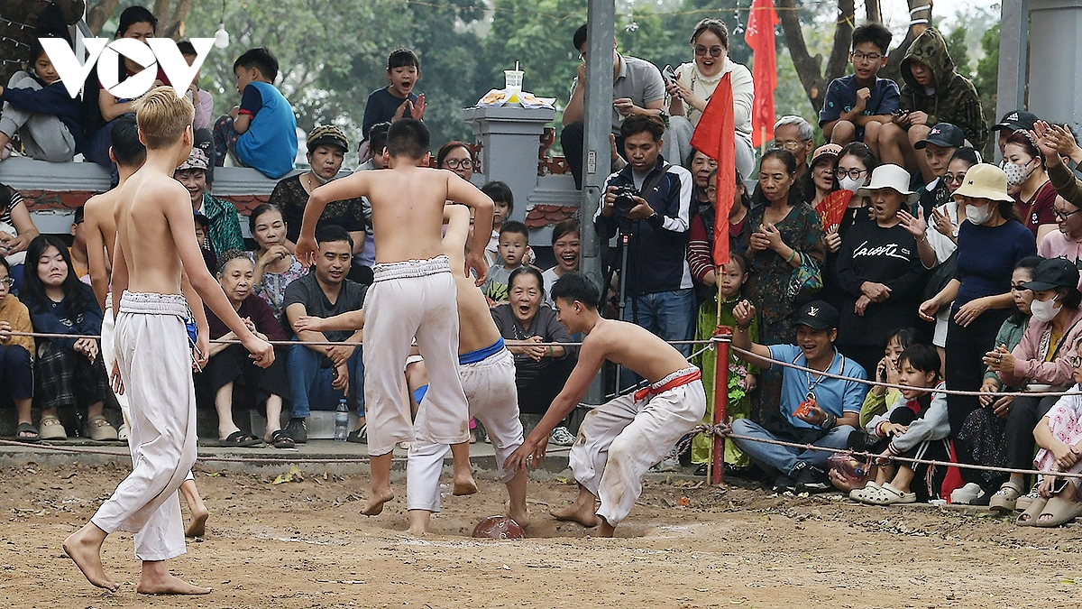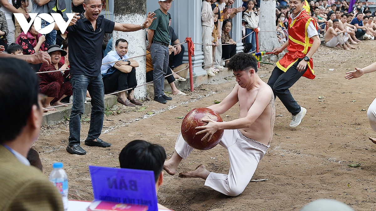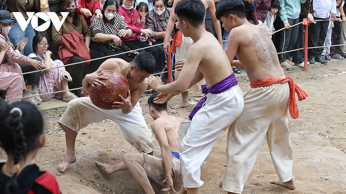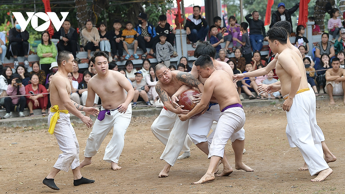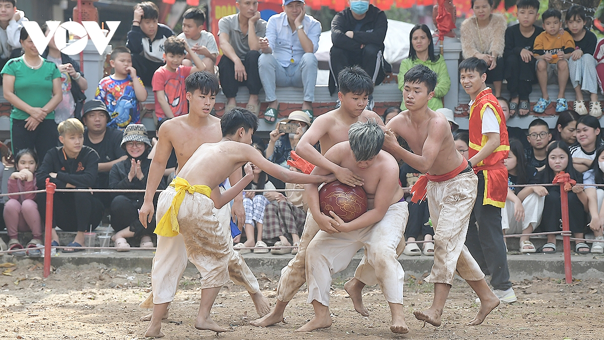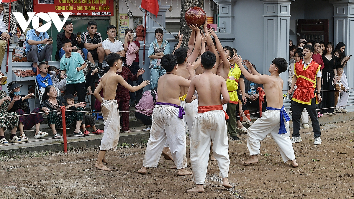 Trong thời tiết ấm áp của những ngày đầu xuân Bính Ngọ 2026, trai tráng Thúy Lĩnh mình trần, mặc quần trắng có thắt đai đỏ, xanh, tím, vàng tương ứng với các đội, đã mang đến những trận đấu kịch tính.