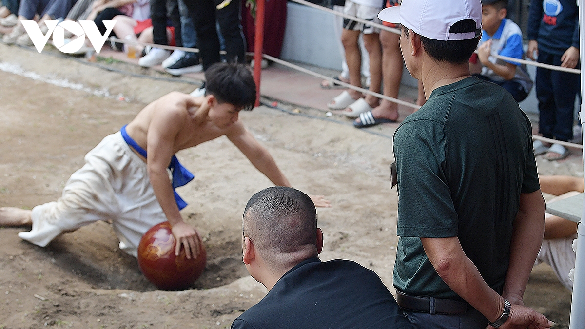 Tâm điểm của ngày thi đấu là màn tranh tài 4 đội trưởng thành thuộc 4 tổ dân phố bởi tính quyết liệt, độ khéo lẽo và kinh nghiệm dày dạn của những vận động viên từng nhiều năm tham gia hội vật cầu.