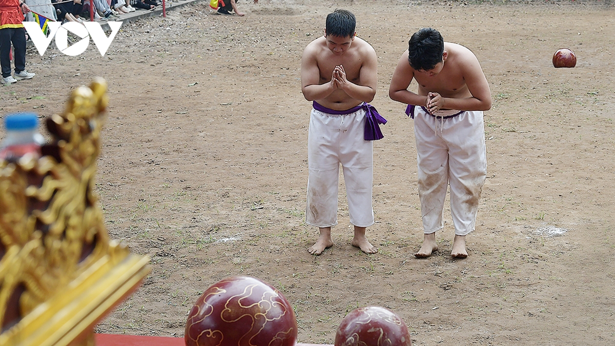 Hội vật cầu làng Thúy Lĩnh Xuân Bính Ngọ 2026 diễn ra dành cho thiếu nhi các lứa tuổi từ 10, 12, 15, 16 tuổi và thanh niên trưởng thành trong phường Lĩnh Nam. Trong ảnh: Hai đội làm lễ thành trước khi thi đấu.