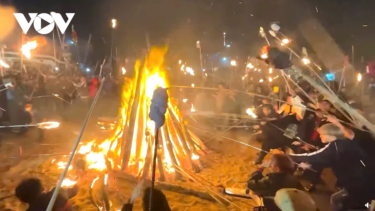 Vào đêm cuối năm, người dân làng biển tập trung đông đủ tại sân đình. Đúng 22 giờ, tại đình thờ tổ, những người già trong làng sẽ làm lễ cúng thần linh, cầu may mắn, cầu cho những chuyến đi biển của người dân trong năm mới thuận lợi. Sau đó, các bậc cao niên khấn xin được rước ngọn lửa từ đình tổ ra thắp lên ở đống củi lớn đặt sẵn ngoài sân đình. Bô lão được lựa chọn để làm lễ, xin lửa là người cao niên, có uy tín, có đầy đủ các yếu tố như “kinh tế lưỡng vượng, phu thê thông toàn, con cái đủ cả trai, cả gái”, người này sẽ thắp lửa và rước ra trước sân đình, châm lên ngọn lửa lớn để chia sẻ cùng dân làng.