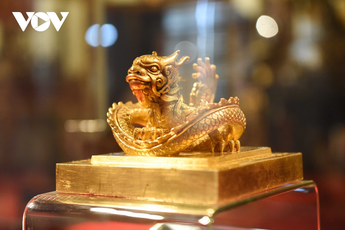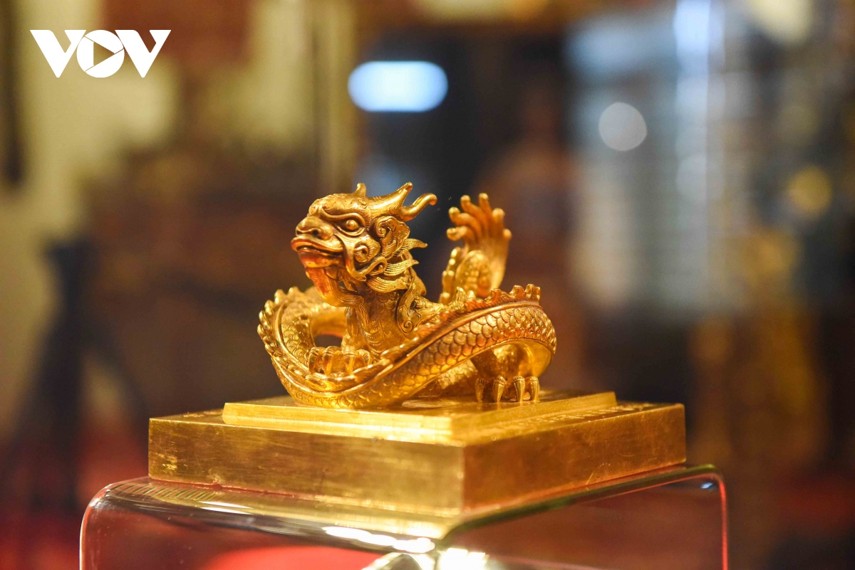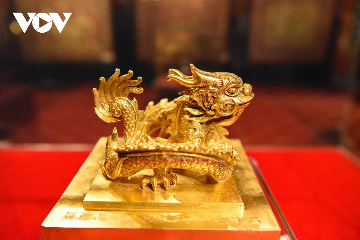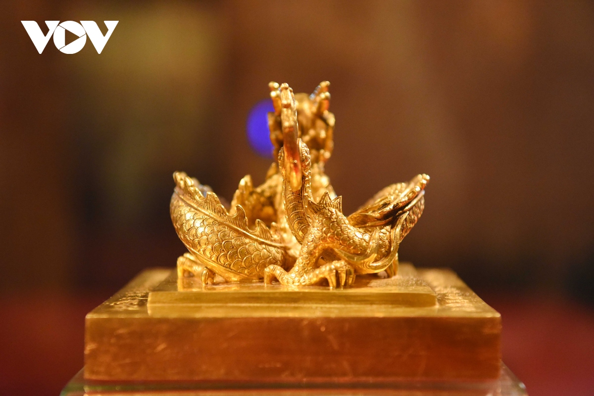 Ấn vàng " Hoàng đế chi bảo" được chạm khắc tinh xảo, là đỉnh cao của nghệ thuật chạm khắc.