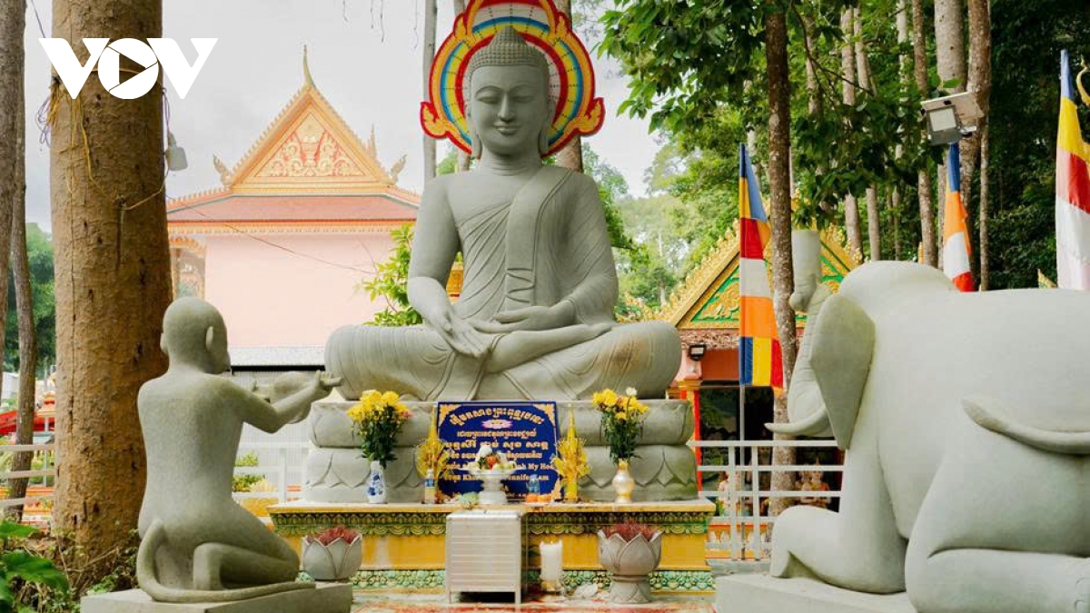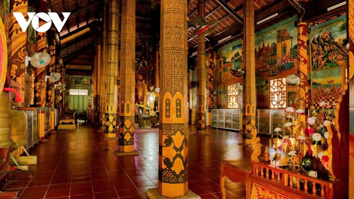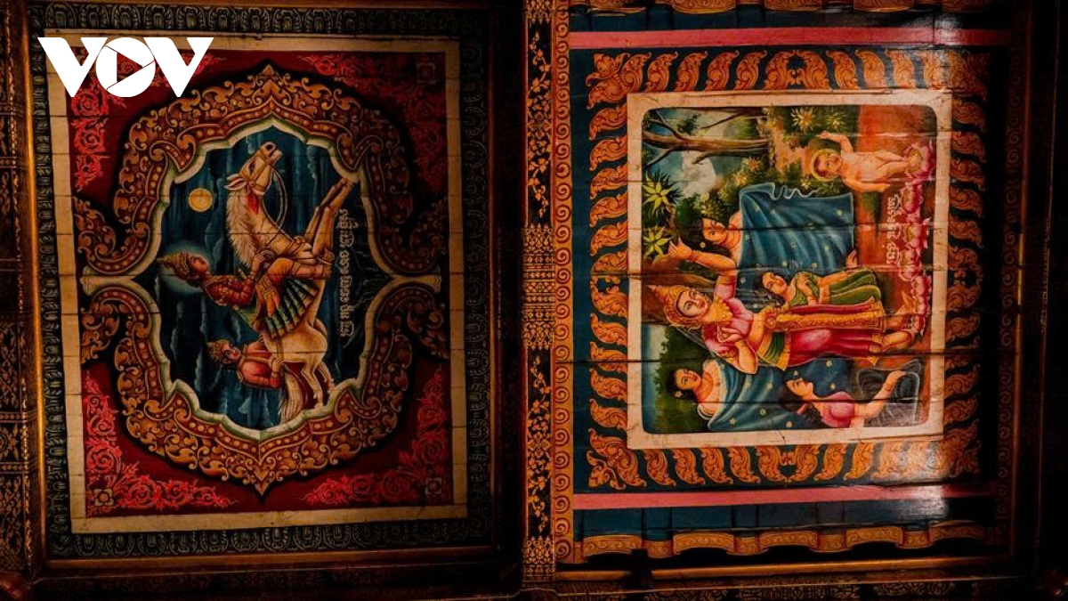 Đặc biệt, trần và tường chính điện được phủ kín bởi các bức tranh bích họa tái hiện trọn vẹn cuộc đời Đức Phật Thích Ca Mâu Ni: từ đản sinh, xuất gia, tu hành, thành đạo đến nhập Niết bàn. Đây không chỉ là tác phẩm mỹ thuật mà còn là “giáo trình trực quan” truyền dạy giáo lý Phật giáo cho cộng đồng Khmer qua nhiều thế hệ.