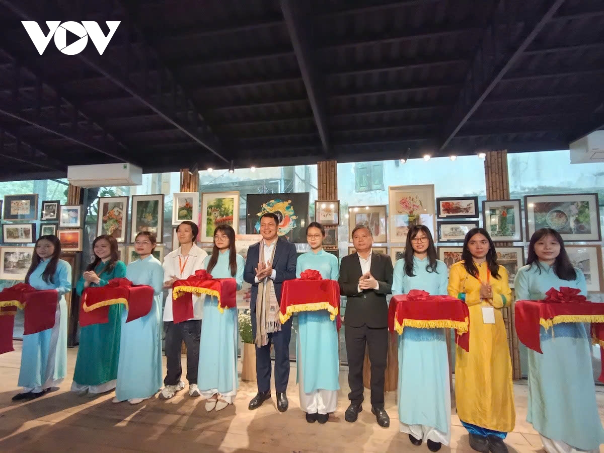 Không gian trưng bày được thiết kế như một làng nghệ thuật giữa lòng di sản, với khung tre, dây thừng, cá chép, cào cào lá dứa xen lẫn cùng tranh, tạo cảm giác dân gian thân thuộc. Khách tham quan không chỉ ngắm tranh mà còn có thể trực tiếp tham gia các hoạt động sáng tạo như ký họa, in tranh, vẽ dát vàng, hay tạo hình từ tre, lá dừa.