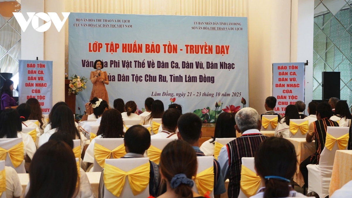 VOV.VN - Sáng 23/10, tại Bảo Lộc, Lâm Đồng, Cục Văn hóa các dân tộc – Bộ Văn hóa, Thể thao và Du lịch phối hợp với Sở Văn hóa, Thể thao và Du lịch tỉnh Lâm Đồng bế giảng lớp tập huấn bảo tồn – truyền dạy văn hóa phi vật thể về dân ca, dân vũ, dân nhạc của dân tộc Chu Ru.