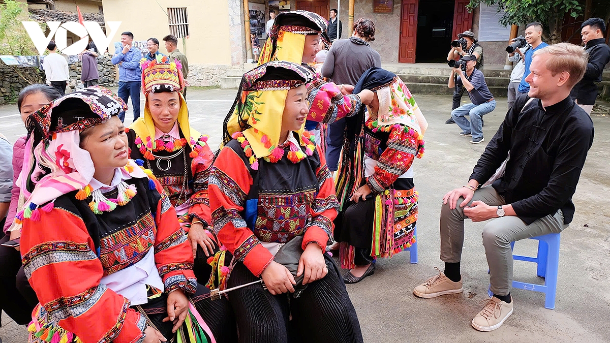 Du khách giao lưu cùng người dân bản Lô Lô Chải, xã Lũng Cú tại Lễ cúng tổ tiên của người Lô Lô năm 2022.