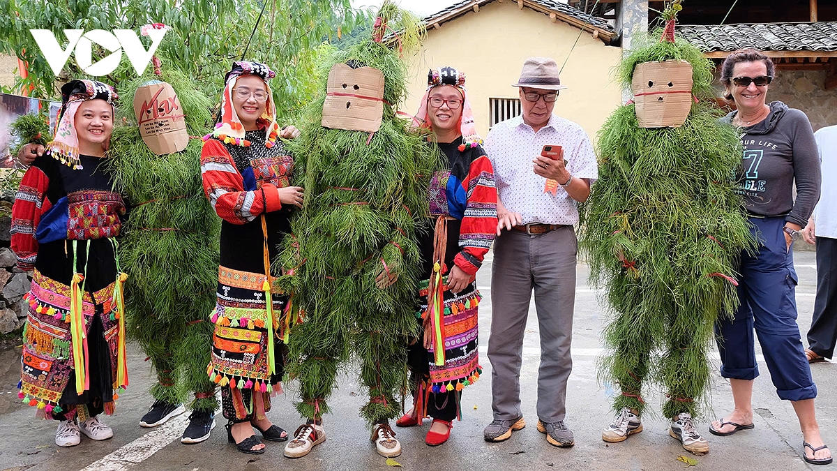 Du khách thích thú chụp ảnh cùng "Ma cỏ" tại Lễ cúng tổ tiên của người Lô Lô đen xã Lũng Cú năm 2022.