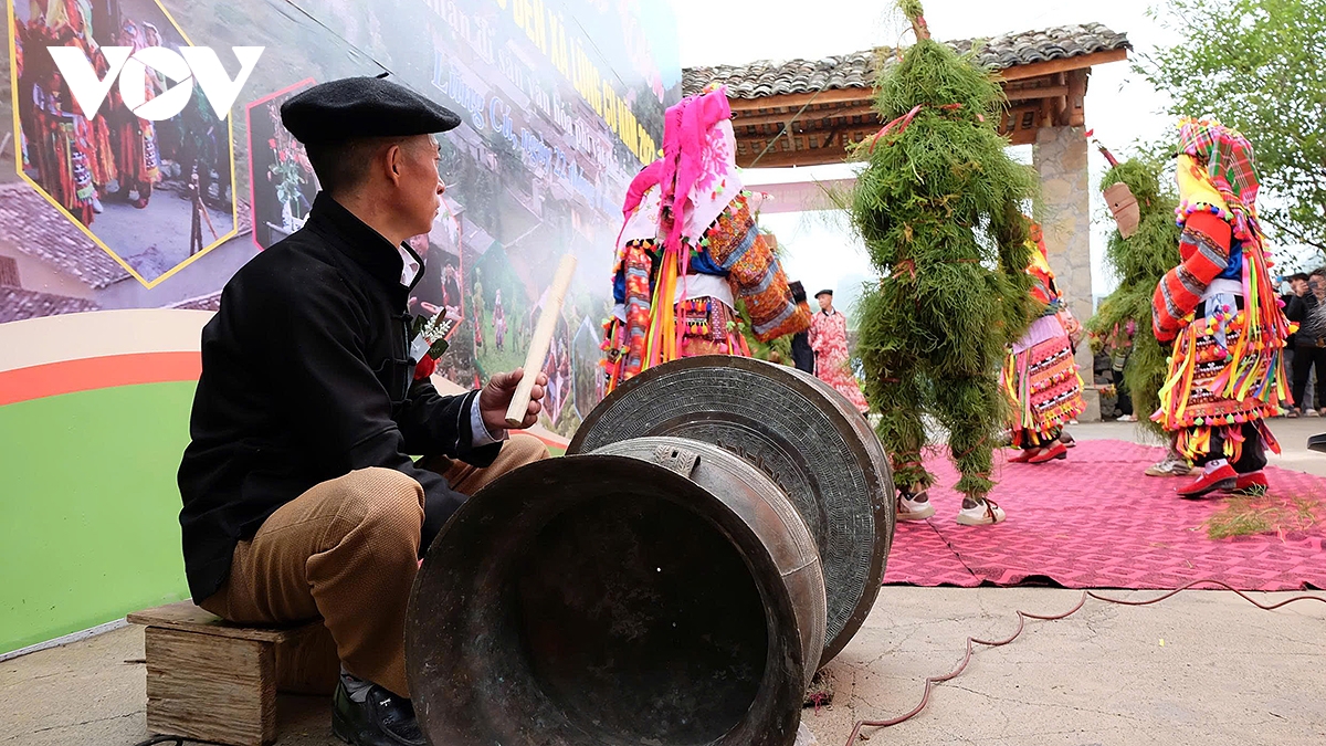 Đánh trống đồng và nhảy lễ tại Lễ cúng tổ tiên của người Lô Lô đen xã Lũng Cú năm 2022.