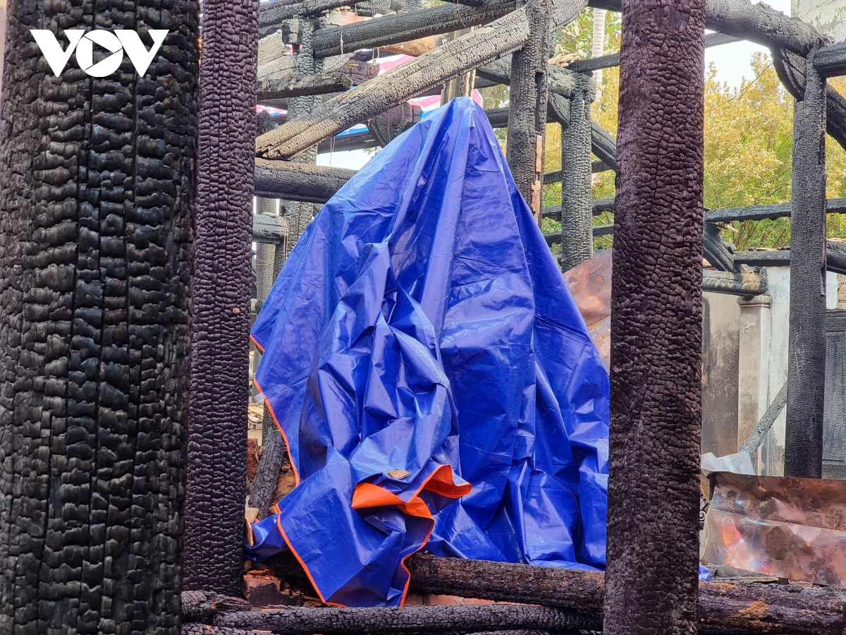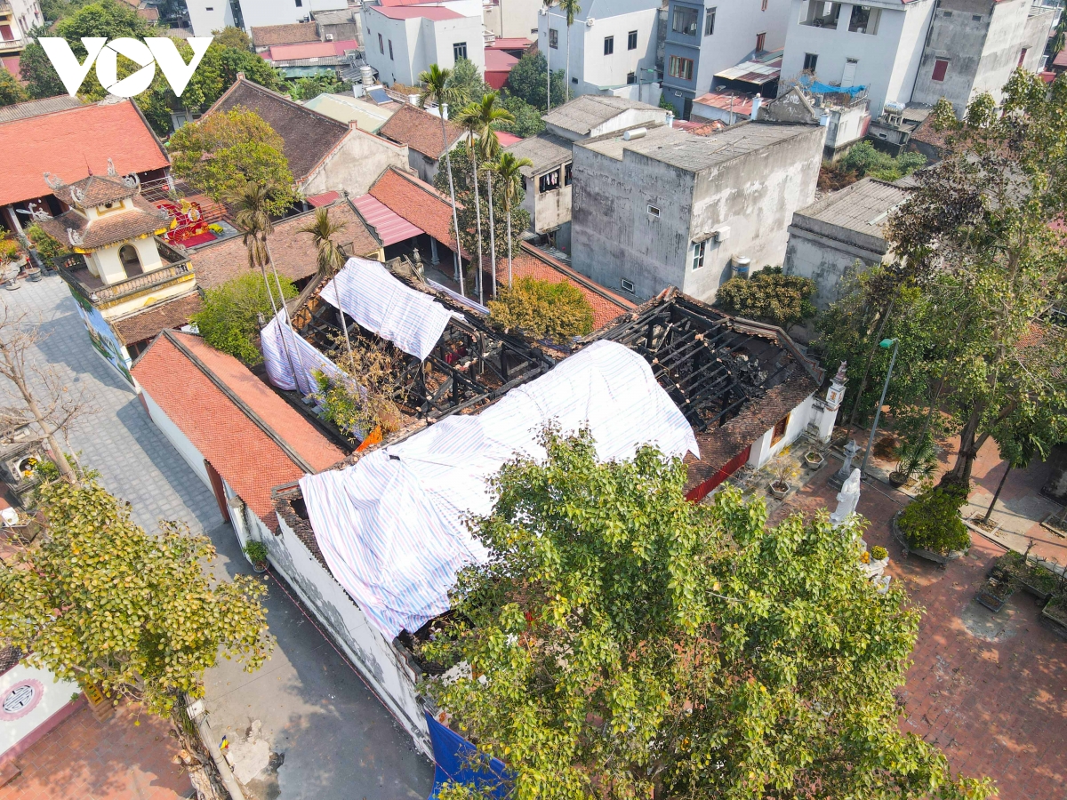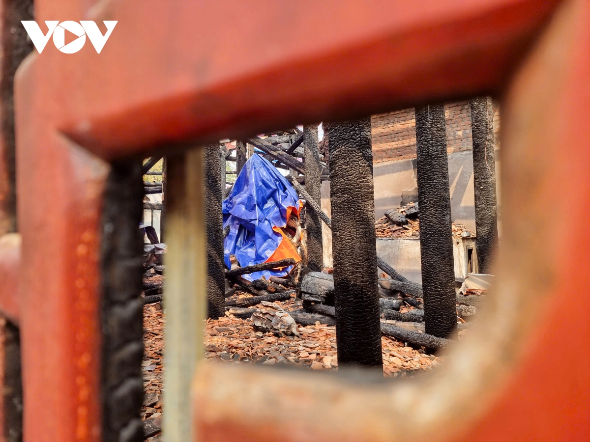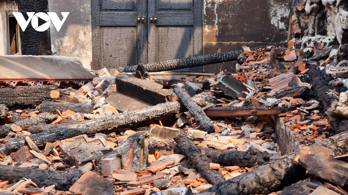 Tòa chính điện gồm 5 gian, 4 mái bị thiêu rụi. Hai tòa nhà bên cạnh may mắn được khống chế không cho cháy lan.