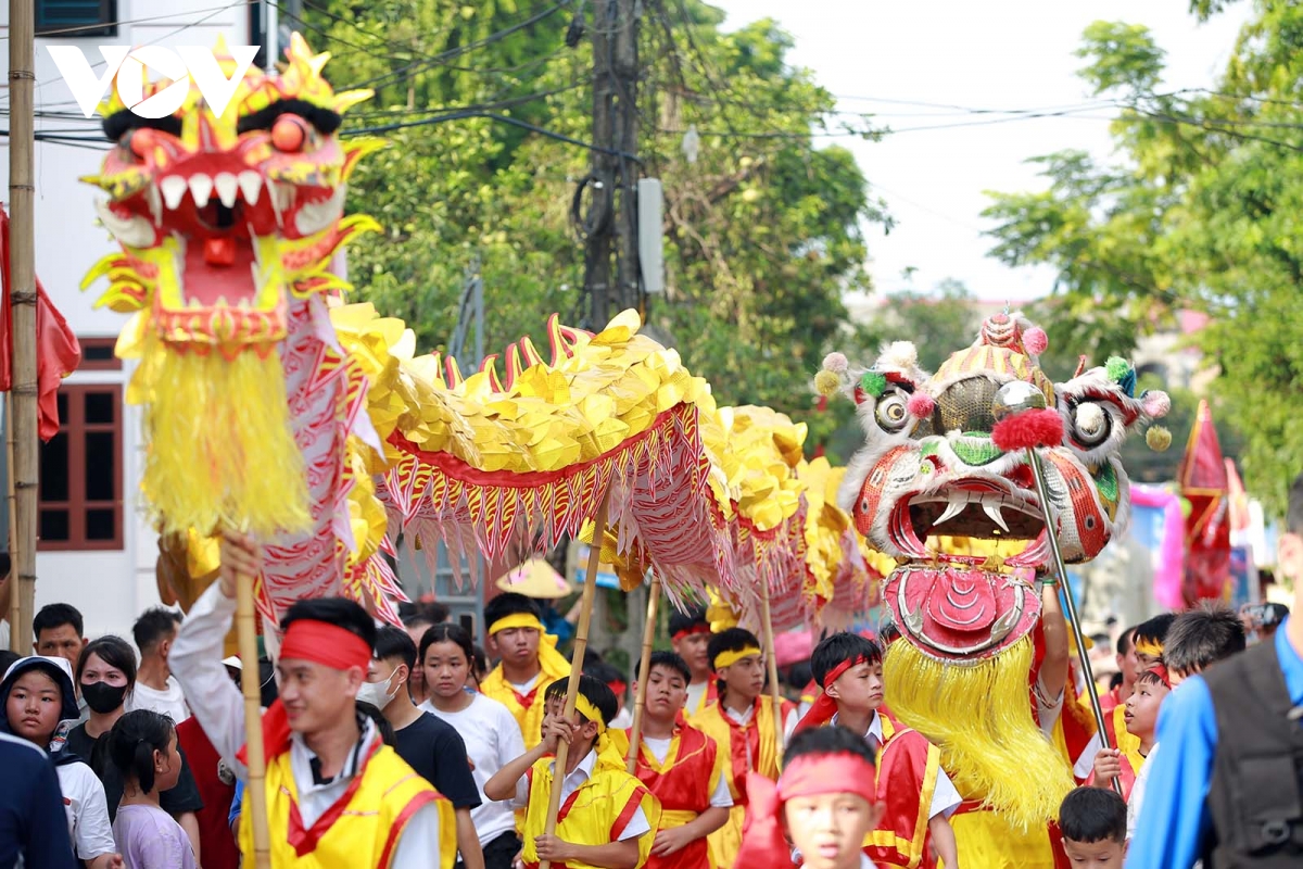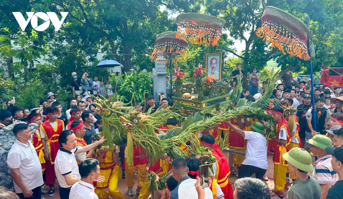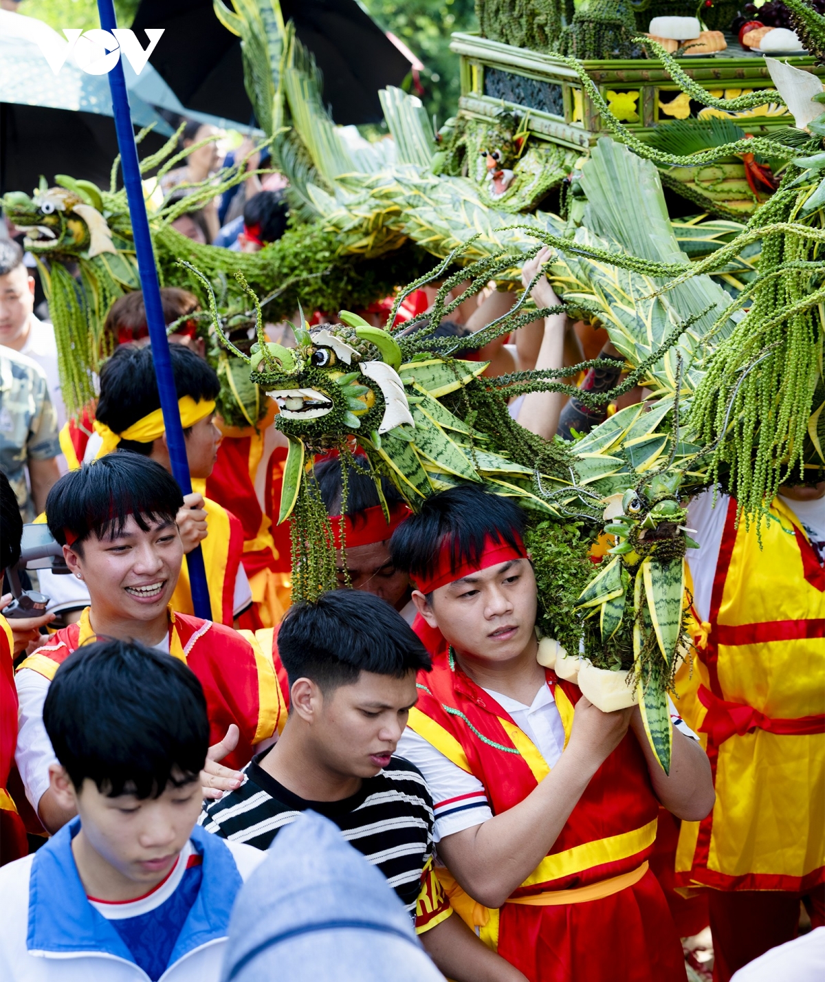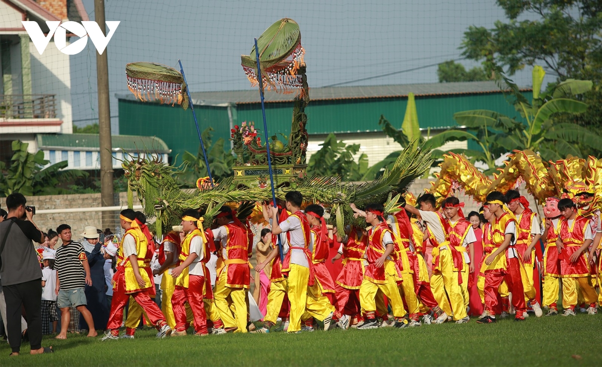 Kiệu rồng được rước đến sân vận động đầu xóm, để người dân khắp nơi cùng tham gia và hòa chung không khí lễ hội.