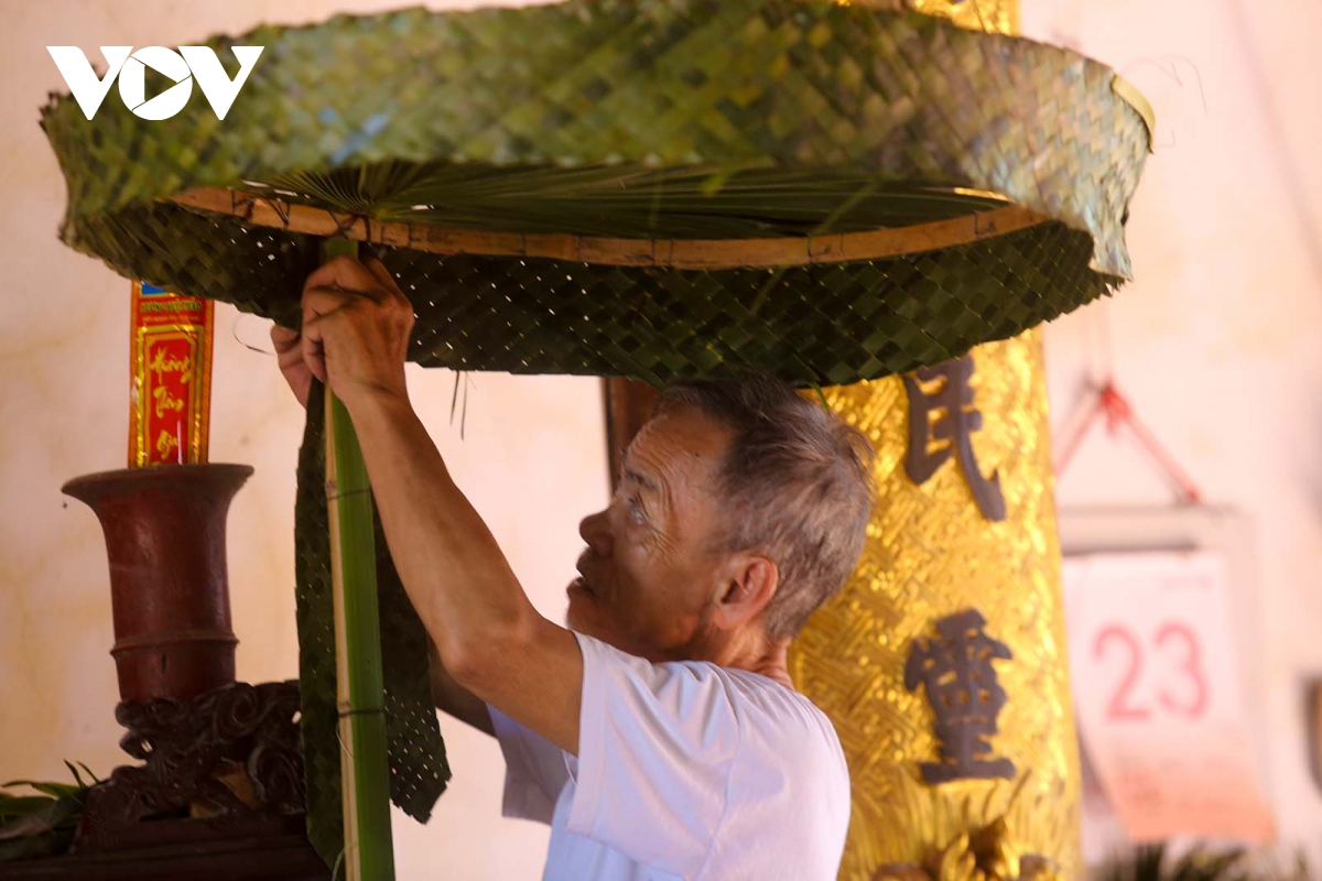 Một tuần trước, các cụ cao niên cùng thanh niên trong thôn bắt tay làm kiệu lá, với những vật liệu có sẵn ở địa phương.