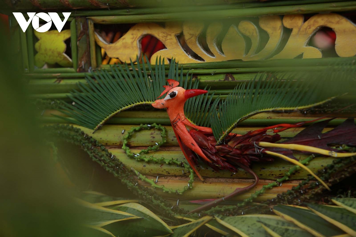 Nhiều chi tiết hoa văn trên kiệu được tạo hình tỉ mỉ trên các chất liệu như lá vạn tuế, mo cau, tàu dừa, vỏ bưởi...