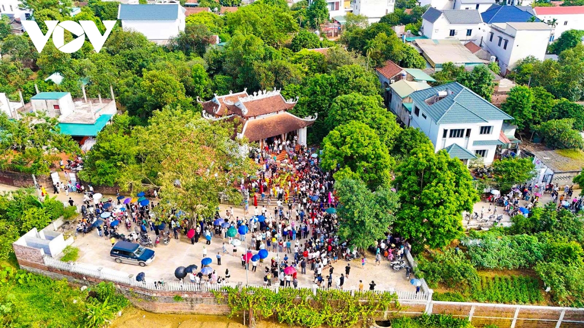 Nhìn từ trên cao, rất đông người dân tham gia rước tại một địa điểm kiệu dừng chân trong thôn.