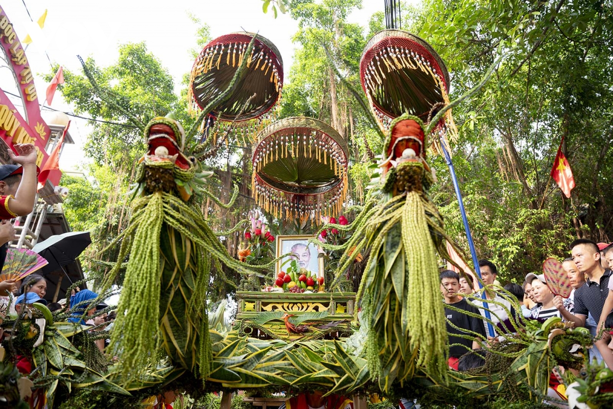 “Ai trong thôn không nói ra nhưng đều hiểu, kiệu lá là linh hồn của Tết Trung thu. Dù mưa gió thế nào, chúng tôi cũng phải làm, không phải để thi thố, mà để giữ lấy ngọn lửa truyền thống", anh Gia Chính chia sẻ thêm. Ảnh: Kiệu được rước đến từ Quán Chính Linh Từ.