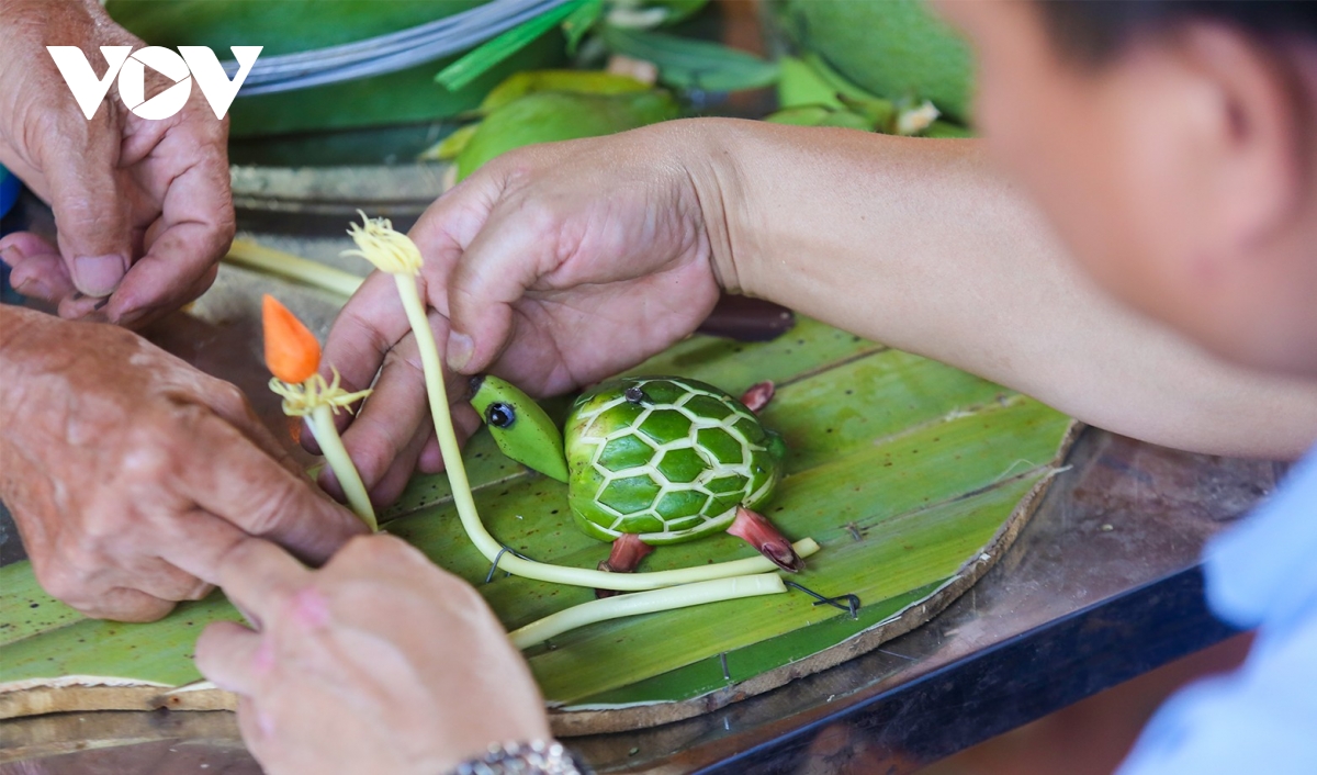 Hình ảnh tứ linh gồm long, lân, quy, phụng cũng được khéo léo thể hiện bằng quả đu đủ, hoa chuối, quả chuối.