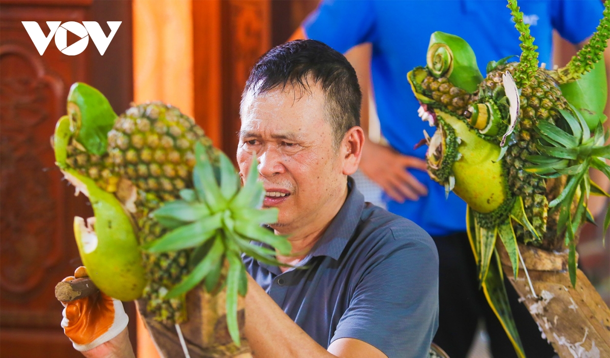 Phần củ chuối sau khi làm sạch được gọt, khắc tạo dáng phần đầu rồng. Sau đó, các loại hoa quả được tạo hình thành họa tiết trang trí lên phần đầu rồng...