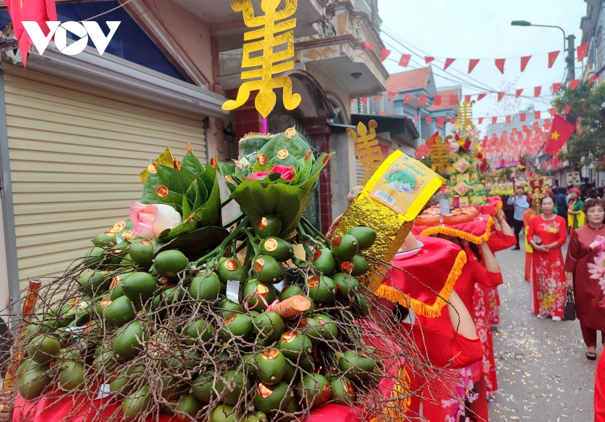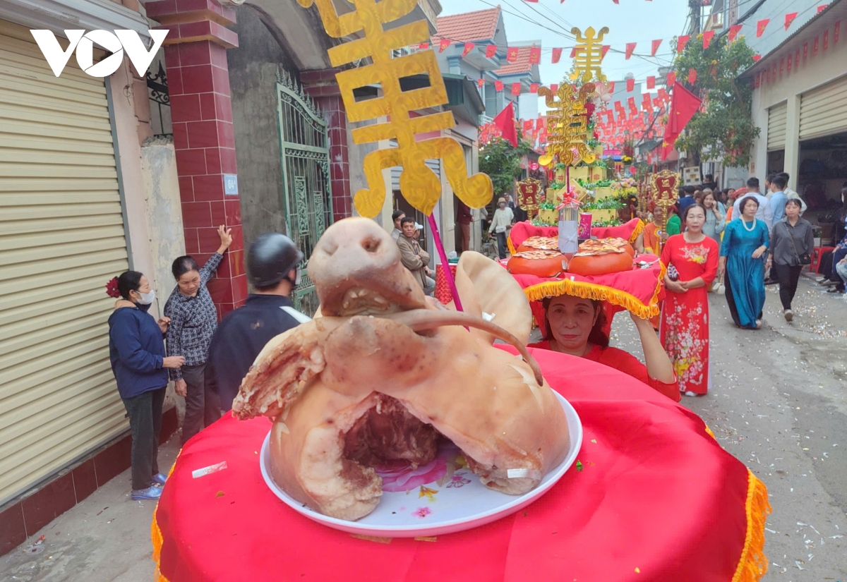 Phần lễ được gia đình và các dòng họ chuẩn bị công phu, chu tất đến từng chi tiết. Mỗi đoàn rước thường có từ 5 đến 7 mâm lễ, do những người phụ nữ trong trang phục truyền thống trang nghiêm đội trên đầu.