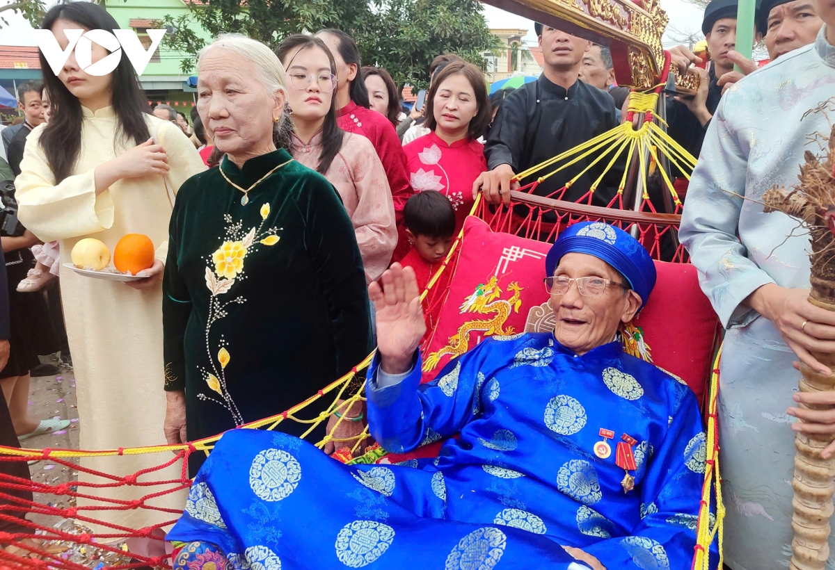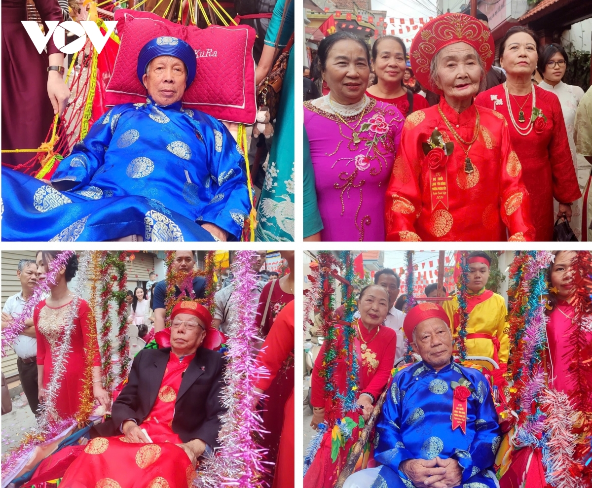 Các cụ thượng thọ (90 tuổi mặc áo đỏ, 80 tuổi mặc áo xanh) nằm trên võng đào, được con cháu trong dòng họ rước lên miếu.