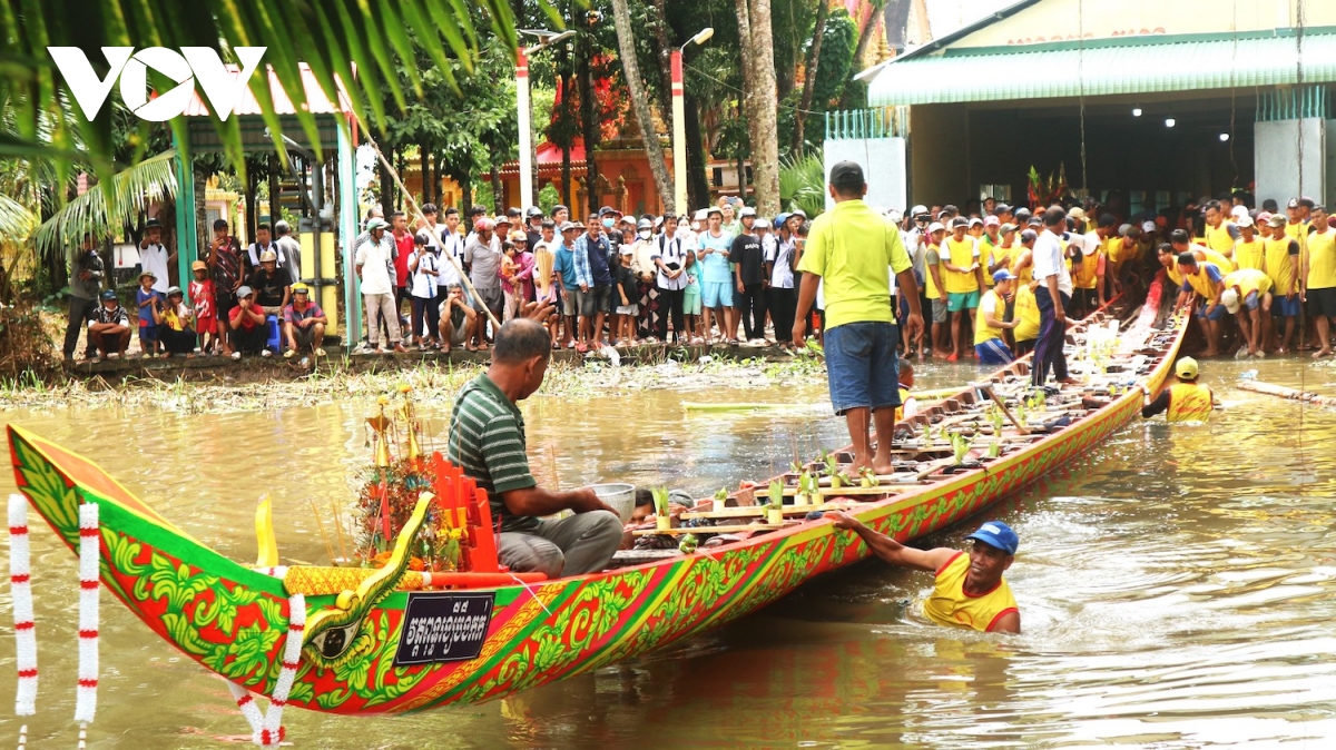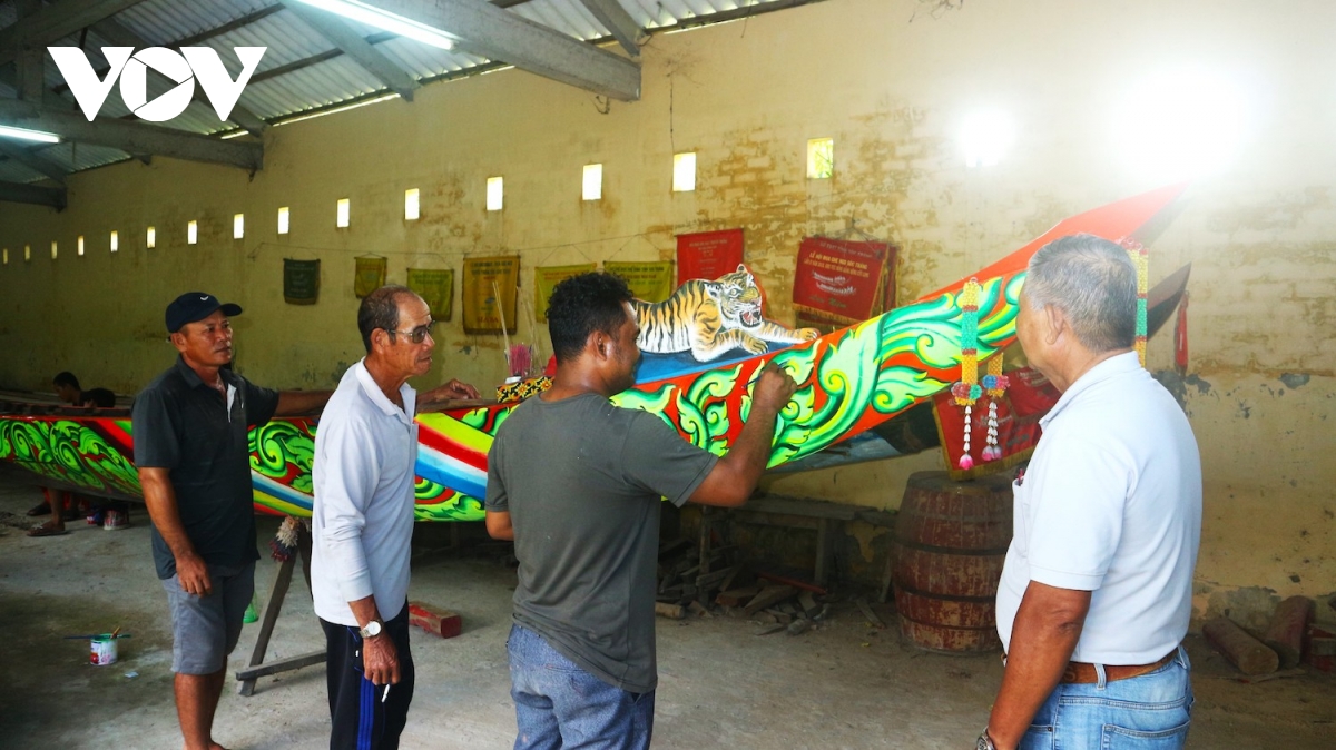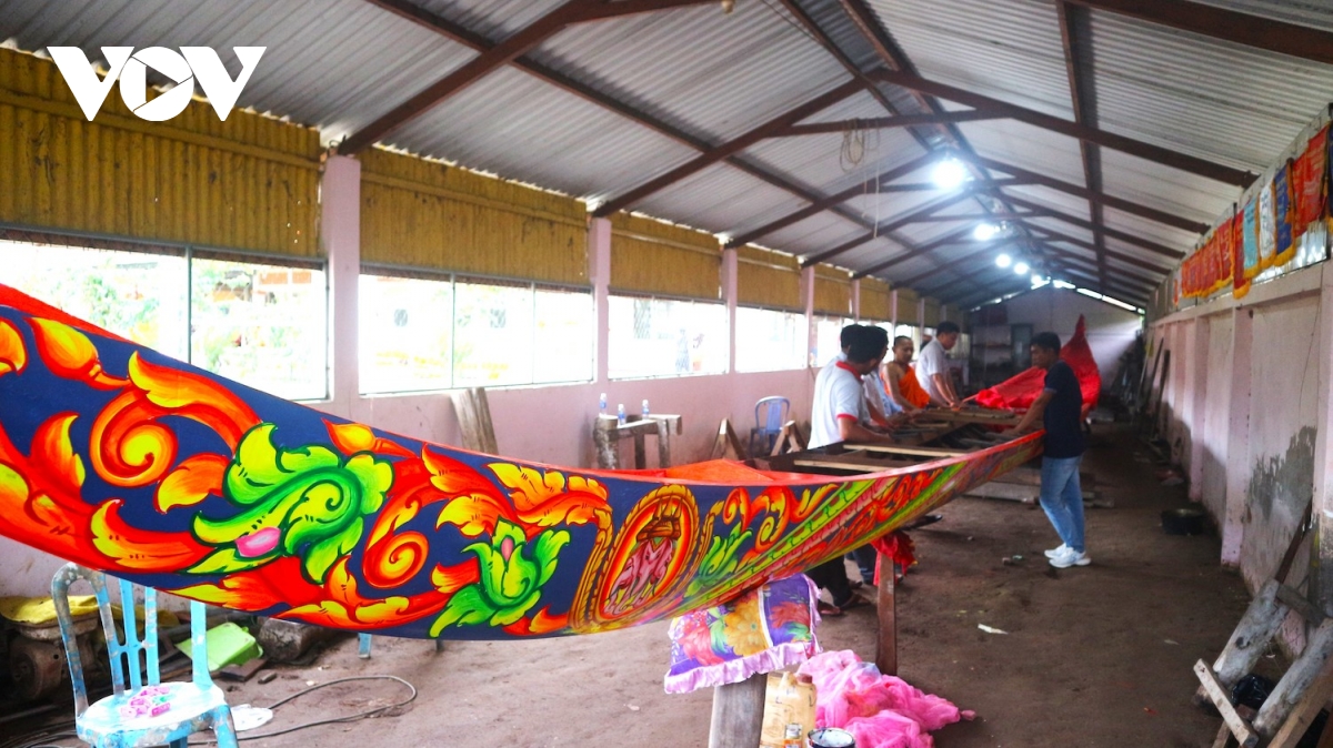 Trước khi tham gia lễ hội, đồng bào Khmer tổ chức sơn, sửa, lên hoa văn cho ghe Ngo