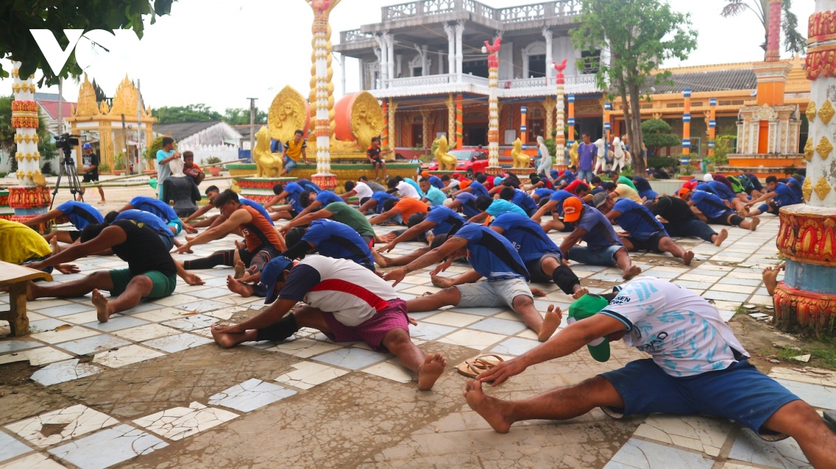 Vận động viên chùa Pich MengKol (Phường Vĩnh Phước, thị xã Vĩnh Châu, tỉnh Sóc Trăng) đang tập luyện trong khuôn viên chùa chuẩn bị tham gia lễ hội