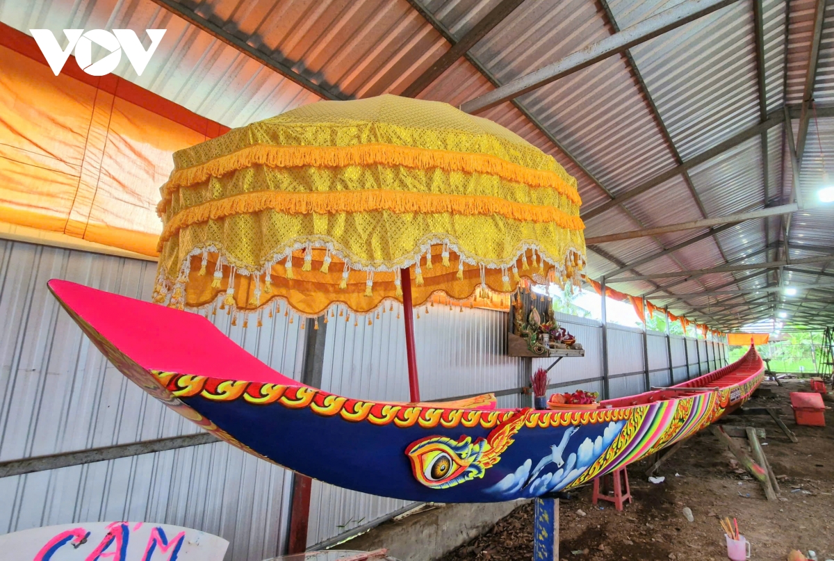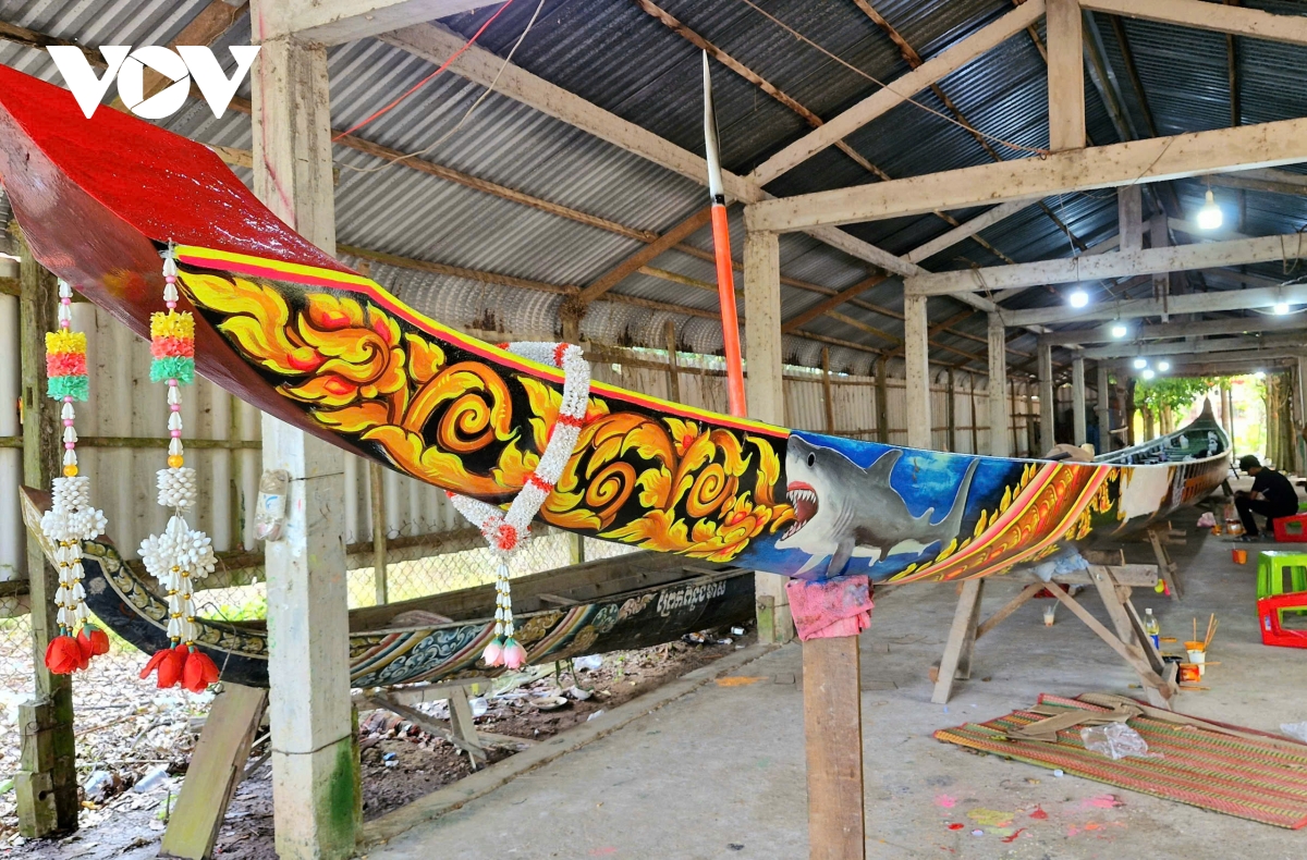 Trước khi hạ thủy đi tham gia thi đấu, đồng bào Khmer sẽ tu sửa, trang trí hoa văn rực rỡ cho ghe ngo