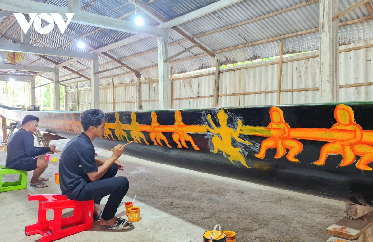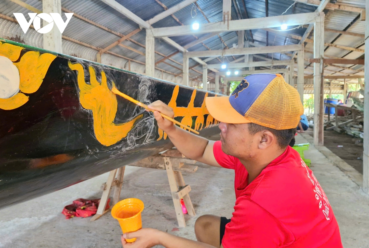 Đồng bào Khmer đang vẽ văn hoa lên ghe ngo