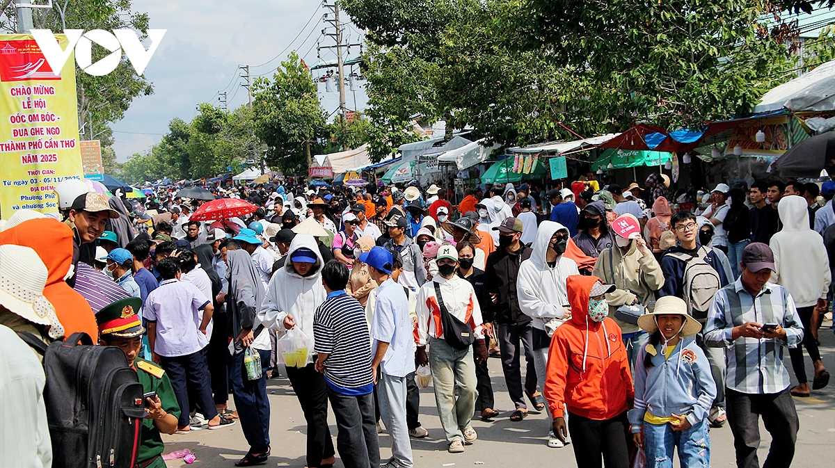 VOV.VN - Trên bờ sông Maspero (phường Phú Lợi và phường Sóc Trăng, thành phố Cần Thơ), nơi tổ chức lễ hội Oóc Om Bóc - đua ghe Ngo, người dân nô nức kéo đến, dòng người chen chúc, đứng chật kín hai bên bờ, có người thì trèo lên cây, lên mái nhà mong tìm cho mình một chỗ nhìn rõ nhất.