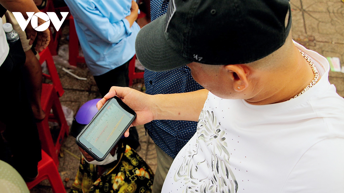Người dân vừa xem trực tiếp trên sông, vừa xem trên điện thoại để tiện theo dõi các ghe Ngo thi đấu.
