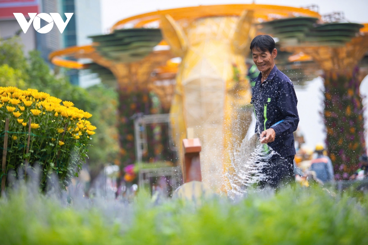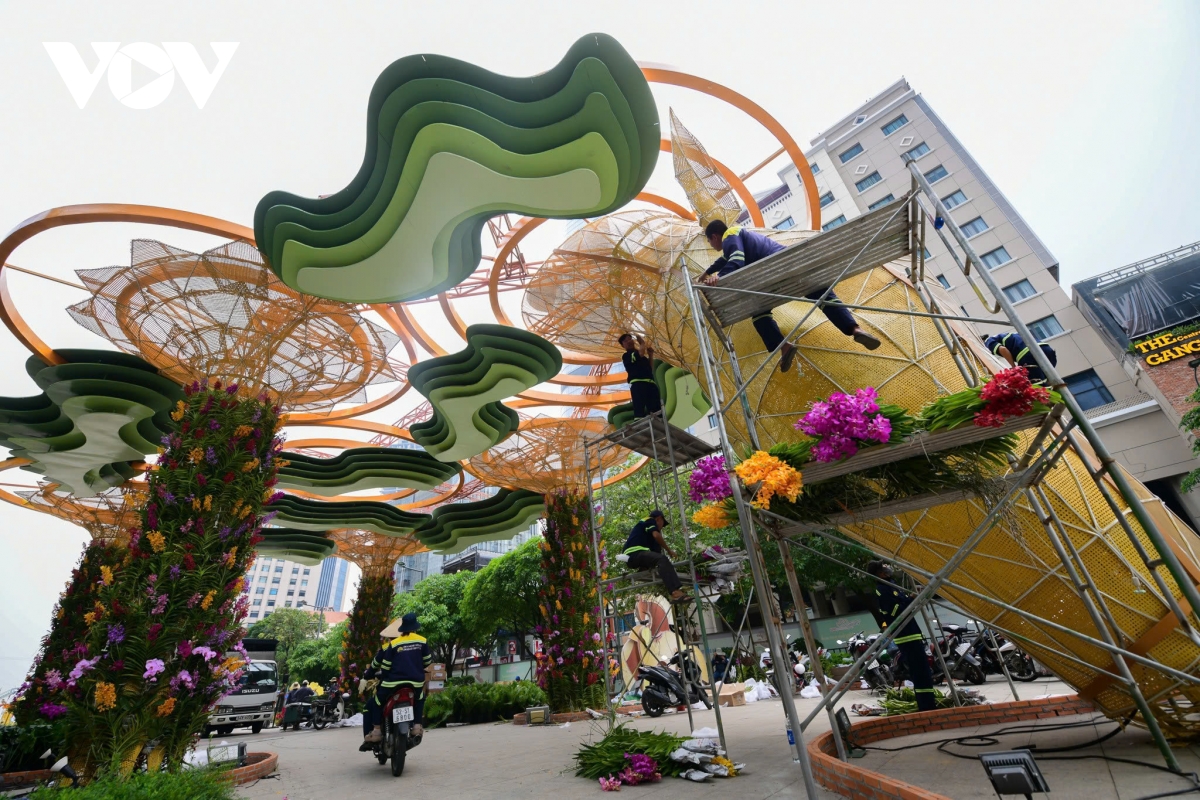VOV.VN - Sau thời gian khẩn trương thi công, các hạng mục tại Đường hoa Nguyễn Huệ cơ bản thành hình và đang gấp rút hoàn thiện các công đoạn cuối cùng để chuẩn bị khai mạc, mở cửa phục vụ công chúng thưởng lãm vào ngày 28 tháng Chạp (ngày 15/2).