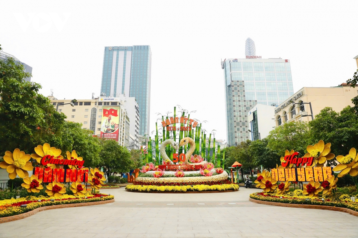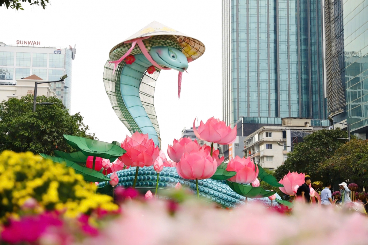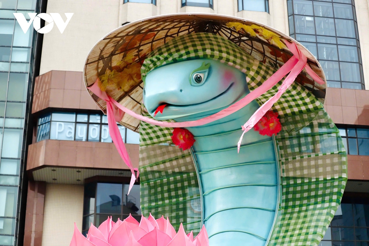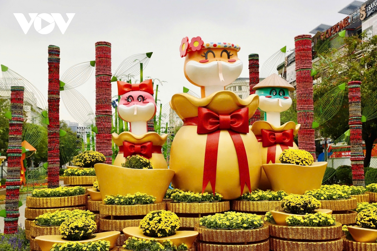 VOV.VN - Sau hơn một tuần thi công, cặp linh vật rắn Kim Tỵ, Ngân Tỵ trên đường hoa Nguyễn Huệ, TP.HCM đã thành hình, thu hút sự chú ý của người dân và du khách nước ngoài.