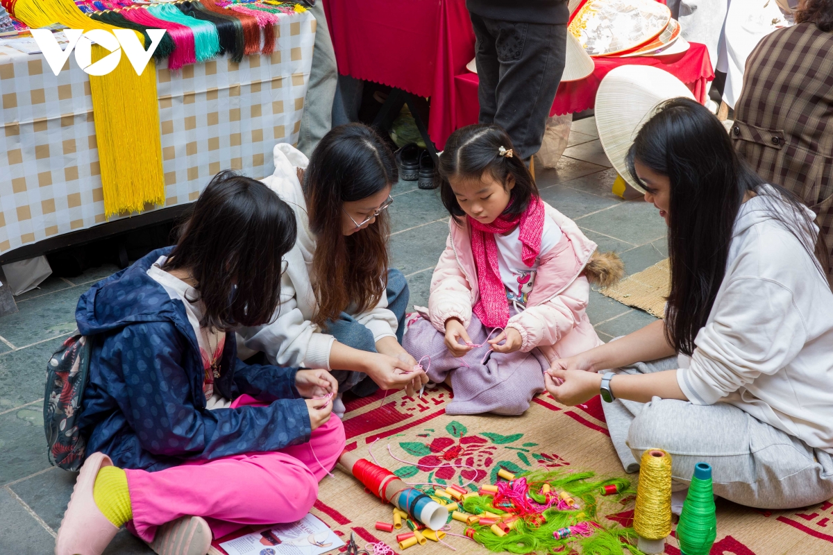 Các bạn sinh viên Gen Z hướng dẫn các em nhỏ se chân chỉ Triều Khúc, cảm nhận sự tỉ mỉ, công phu của nghề truyền thống, tạo niềm yêu thích văn hóa từ những trải nghiệm trực tiếp.