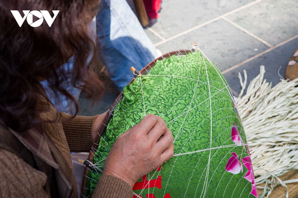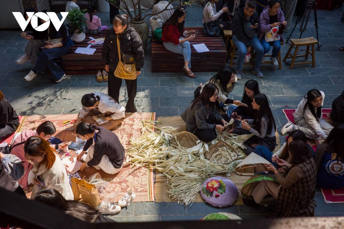Góc workshop "Nón Làng Chuông" thu hút Gen Z, nơi các bạn trẻ tự tay thử nghiệm kỹ thuật đan nón, cảm nhận sự tỉ mỉ và tinh tế của nghề thủ công truyền thống.