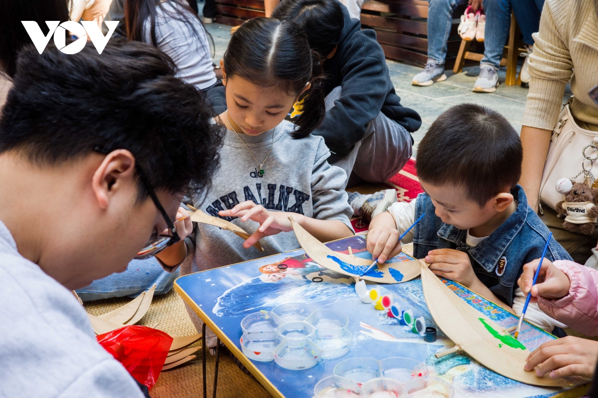 Các bạn nhỏ trải nghiệm vẽ lên diều "Dó và Gió" tại sự kiện.