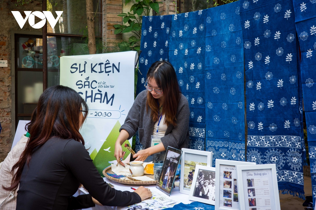 Góc trải nghiệm Sắc Chàm thu hút đông đảo sinh viên, nhiều bạn chia sẻ lần đầu được nhìn tận mắt các bước tạo ra một màu xanh hoàn toàn từ tự nhiên.