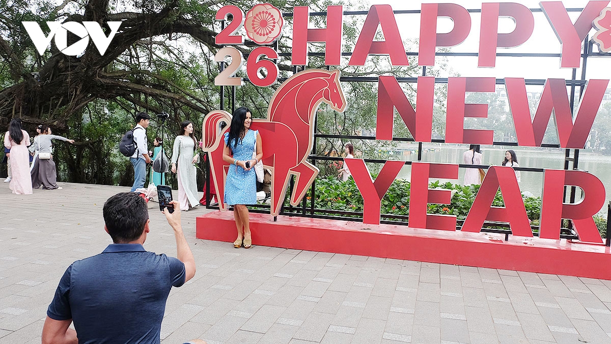 Khách quốc tế check-in bên biểu tượng linh vật ngựa và khẩu hiệu Happy New Year 2026 bên hồ Hoàn Kiếm.