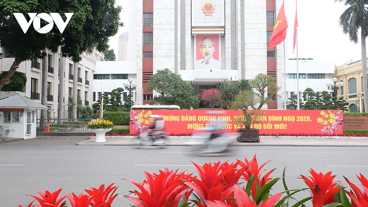 Trụ sở UBND Thành phố Hà Nội cũng được trang hoàng rực rỡ với khẩu hiệu: Mừng Đảng quang vinh, mừng Xuân Bính Ngọ 2026, mừng Đất nước và Thủ đô đổi mới!