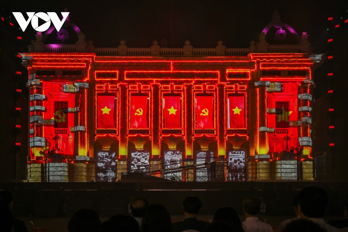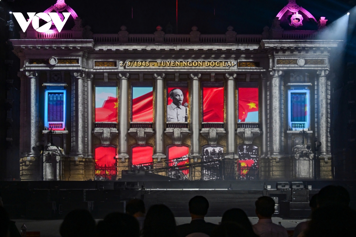 Công nghệ 3D mapping là một điểm sáng nổi bật. Tận dụng kiến trúc mặt tiền Nhà hát Lớn – công trình gắn với nhiều dấu ấn lịch sử – các nghệ sĩ thị giác đã tạo hiệu ứng như xuyên qua thời gian: từ tiếng rồng gầm trong sự kiện Chiếu dời đô thời Lý Công Uẩn, đến khoảnh khắc Bác Hồ đọc Tuyên ngôn độc lập, rồi hình ảnh B-52 bị hạ gục trong 12 ngày đêm cuối năm 1972, lá cờ đỏ sao vàng tung bay… Những hình ảnh ấy không chỉ tái hiện lịch sử mà còn gợi nên niềm tự hào và xúc động sâu sắc.