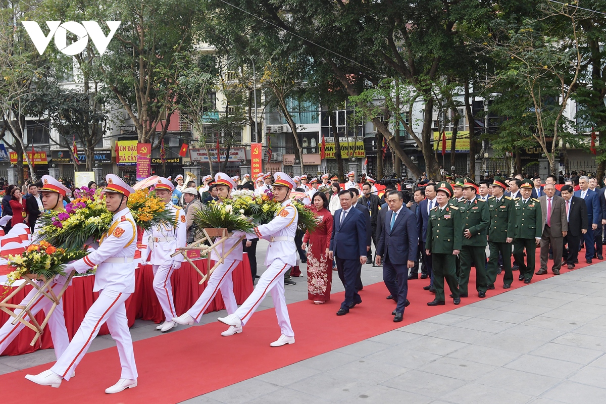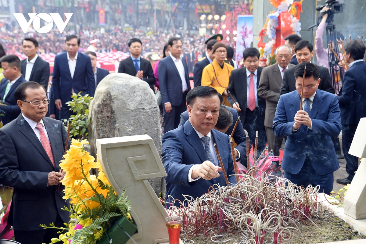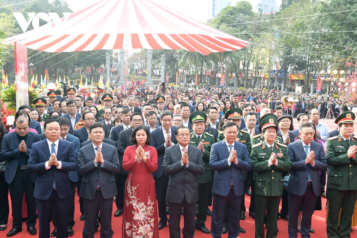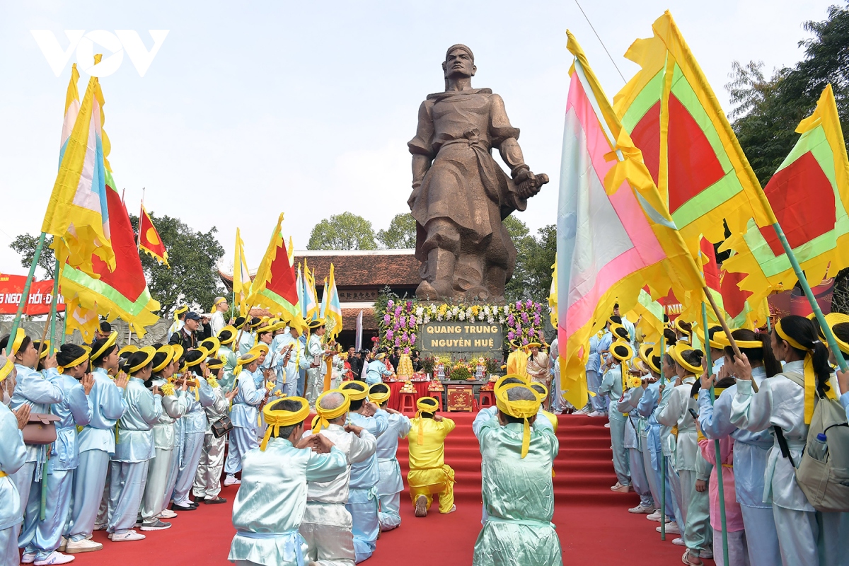 Ông Đinh Tiến Dũng - Ủy viên Bộ Chính trị, Bí thư Thành ủy Hà Nội; nguyên Ủy viên Bộ Chính trị, nguyên Bí thư Thành ủy Hà Nội Phạm Quang Nghị cùng đại diện nhiều cơ quan, ban, ngành, đoàn thể Trung ương và địa phương đã đến dâng hương, dâng hoa trước tượng đài, đền thờ vua Quang Trung.