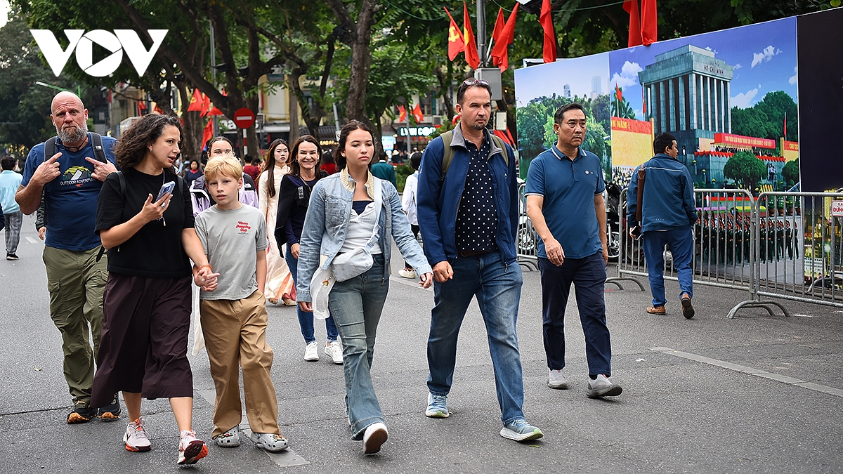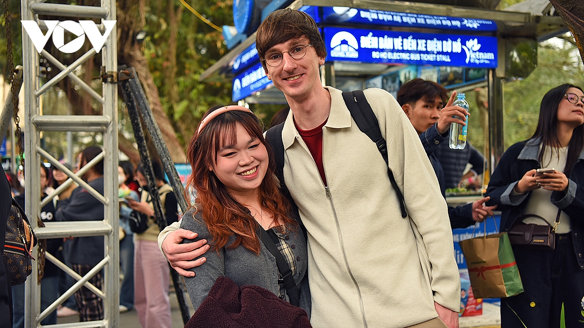 Tại khu vực phố đi bộ hồ Hoàn Kiếm, du khách quốc tế hào hứng chụp ảnh bên các biểu tượng check-in chào năm mới 2026.