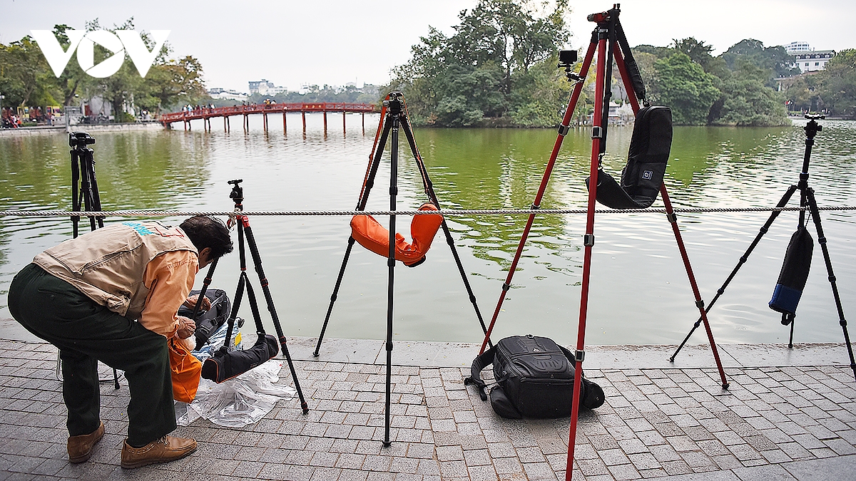Các nhiếp ảnh gia đặt chân máy ảnh để giữ chỗ chụp ảnh pháo hoa đêm giao thừa từ giữa trưa.