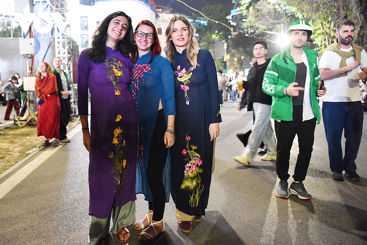 Ba nữ du khách đến từ Vương quốc Anh vui vẻ đón giao thừa trong bộ áo dài Việt Nam truyền thống. Một nữ du khách cho biết, "từ khi chưa đến Việt Nam chúng tôi đã biết đến áo dài, mua cho mình một chiếc áo dài và mặc đi dạo phố là một trong những việc đầu tiên chúng tôi làm khi đến Hà Nội. Được mặc áo dài đón năm mới tại Hà Nội thật tuyệt".