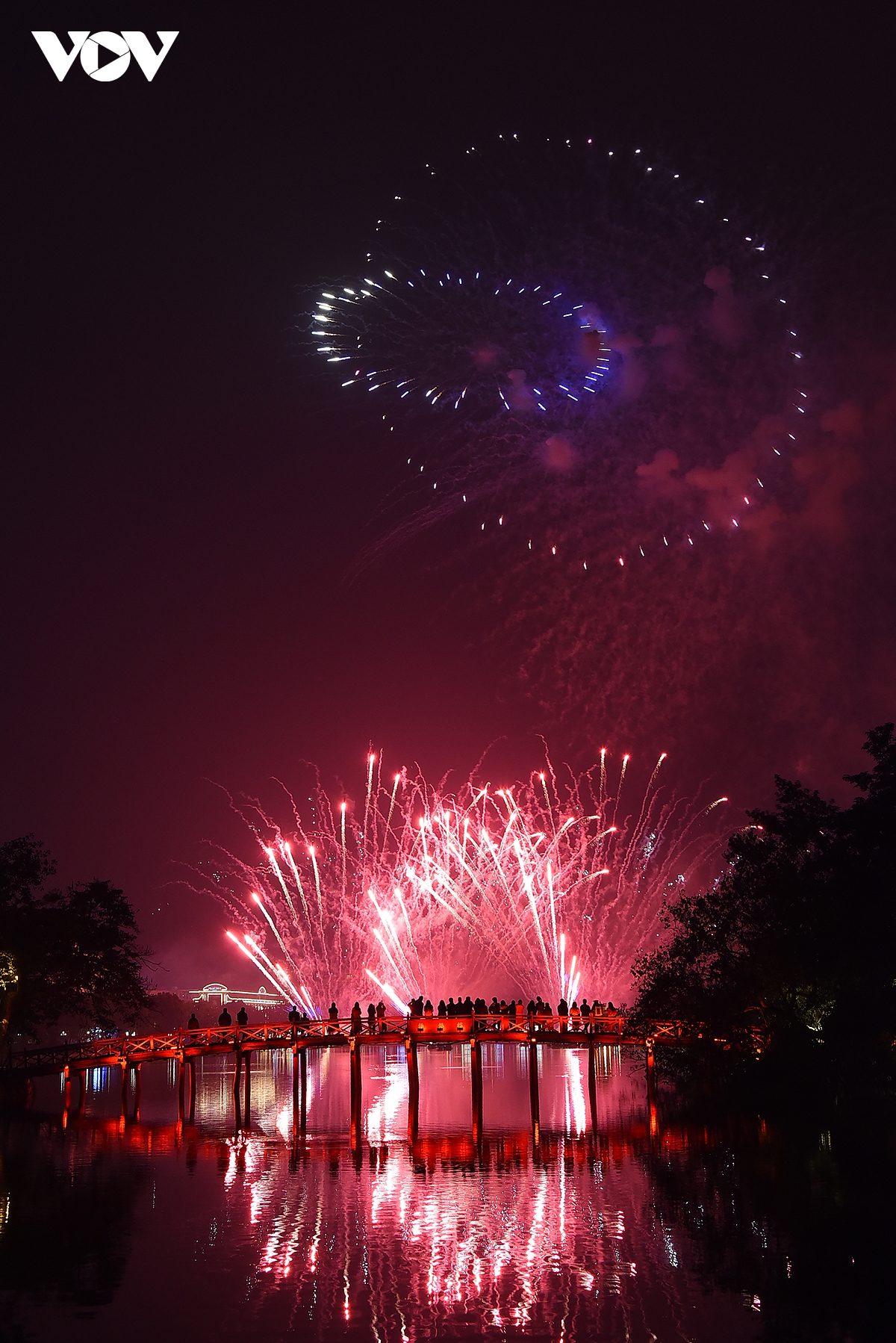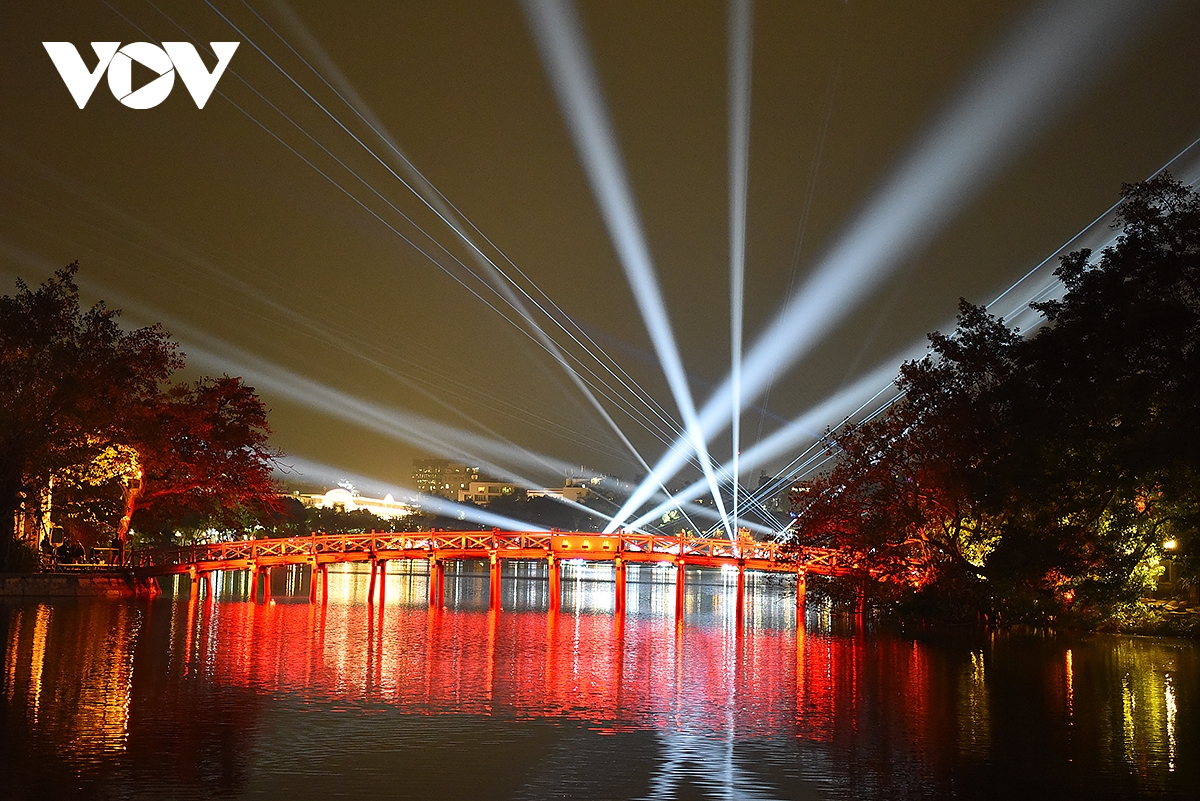 Cầu Thê Húc, hồ Hoàn Kiếm rực rỡ trong ánh đèn trước thời khắc giao thừa.