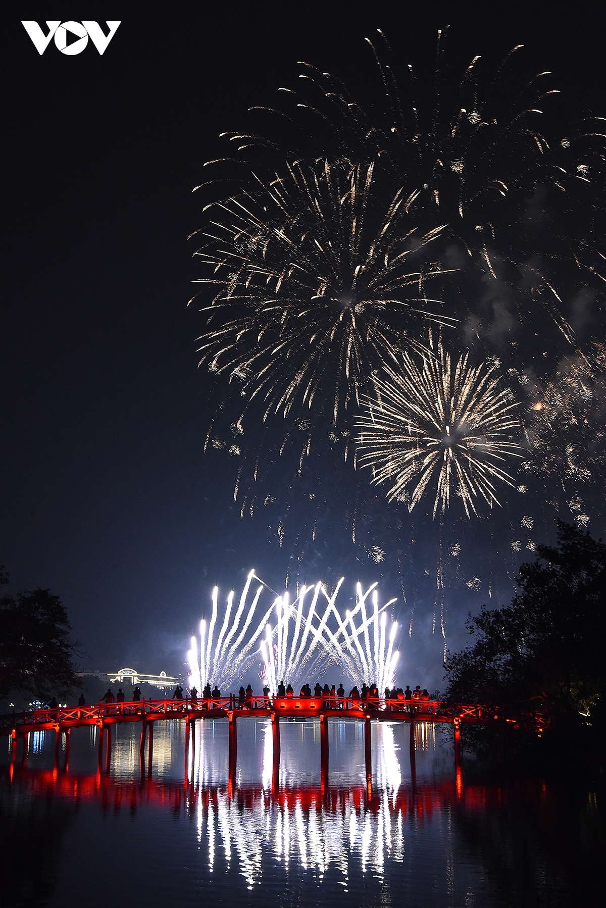 11h45 phút, bầu trời hồ Hoàn Kiếm, thủ đô Hà Nội rực sáng lung linh, màn pháo hoa mừng năm mới 2026 mong đợi chính thức khai hỏa.