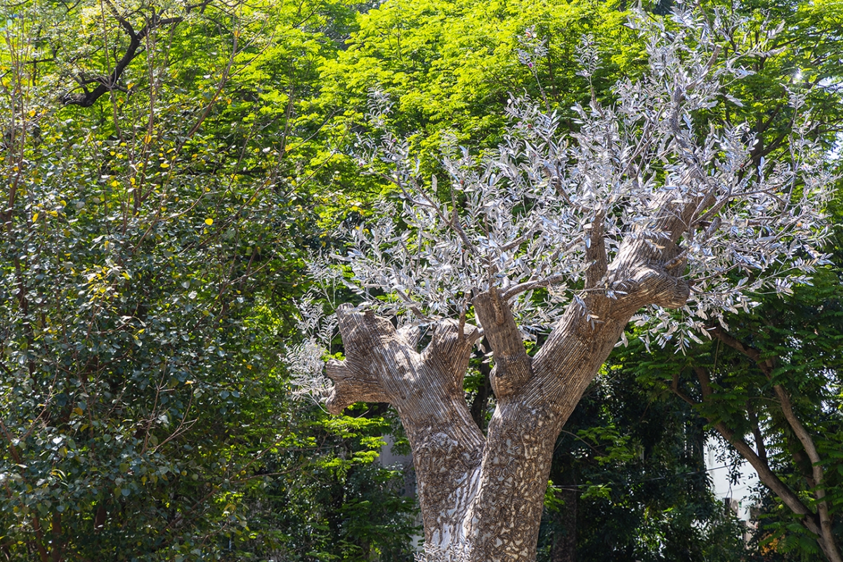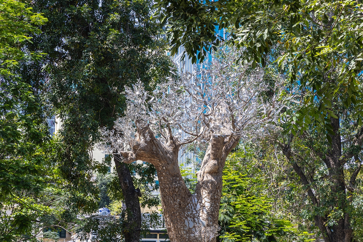 Sau khi cắt gọt toàn bộ thân và rễ cây, phần thân cây được nữ nghệ sĩ ốp bằng những tấm inox dày, gò thủ công. Công đoạn này vô cùng tỉ mỉ để những miếng thép ôm sát vào từng đường cong gồ ghề của thân cây. Các mối nối được hàn kín, tạo thành những nốt và rãnh xù xì như lớp vỏ cây trước đây. Cành cây được mô phỏng những đường nét khúc khuỷu, tự nhiên. Tán lá được tạo nên từ hàng nghìn chiếc lá thép óng ánh, điểm xuyết bởi những “bông hoa” thạch anh lấp lánh đủ sắc màu.