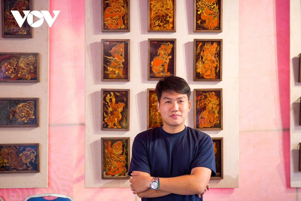 Họa sĩ trẻ Đỗ Quang Hưng (sinh năm 2000) thuộc thế hệ sáng tạo mới đang nỗ lực gọi dậy những giá trị Việt từ kho tàng văn hóa truyền thống. Tại triển lãm “Hỷ Khánh Đăng Nghê”, được tổ chức trong khuôn khổ Festival Bảo tồn và Phát triển Làng nghề quốc tế 2025, 36 bức tranh sơn mài của Hưng cùng các ứng dụng hình tượng Nghê của các nghệ sĩ gây ấn tượng mạnh với công chúng. Mỗi tác phẩm là một khoảnh khắc riêng: Nghê lúc ngồi chầu, khi nô đùa, khi chuyển động nhẹ nhàng hay khi ánh mắt rạng rỡ đầy tinh anh. Tất cả đều có điểm chung là hướng lên trên, mang thần thái hiền hòa, lạc quan – một cách nhìn rất Việt về linh vật này.