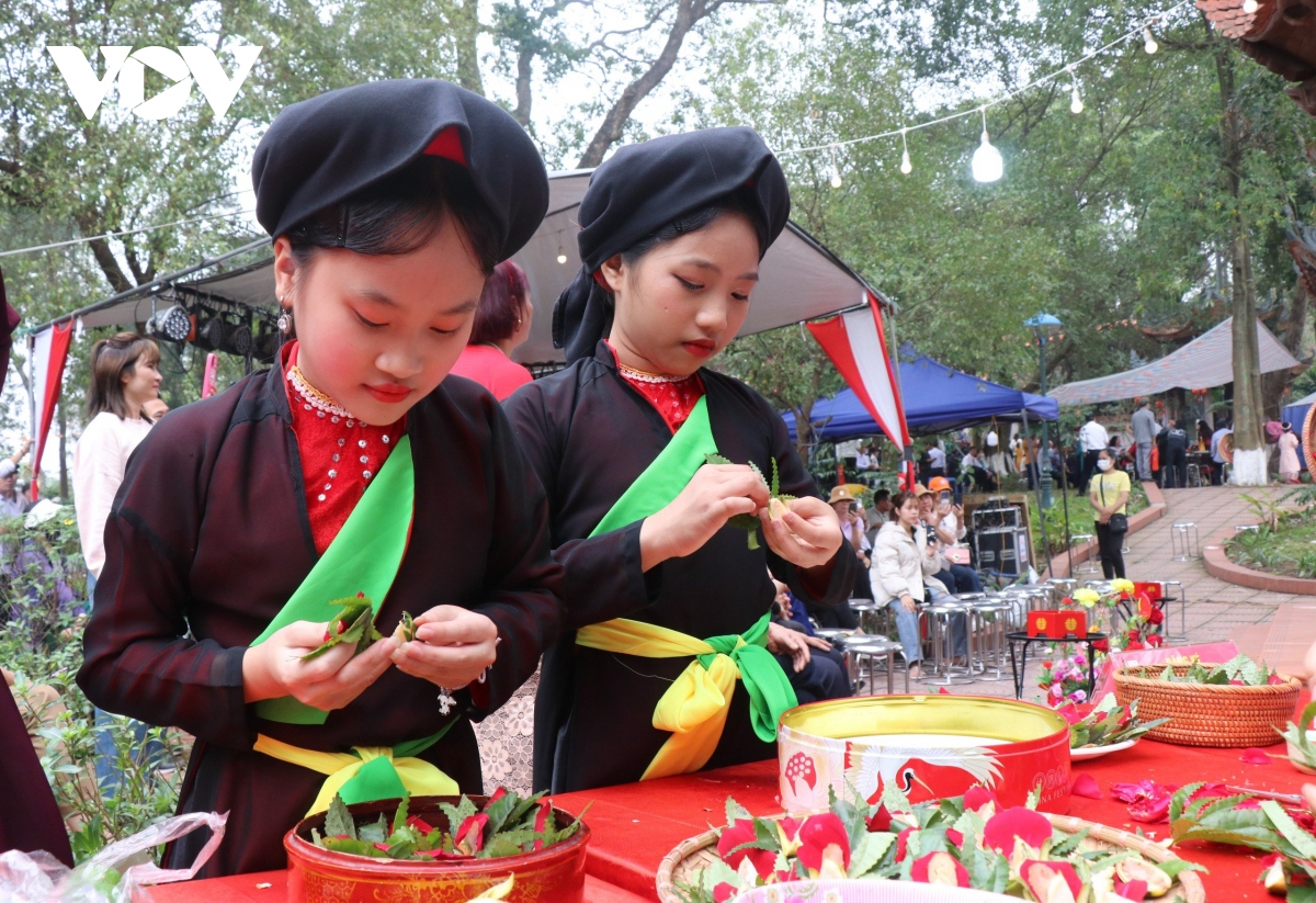 Các liền chị quan họ "nhí" têm trầu cánh phượng.
